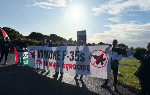 تجمّع نشطاء من حملة التضامن مع فلسطين في أيرلندا، أمام بوابات شركة مويولا للهندسة الدقيقة في كاسلداوسون – جنوب ديري، احتجاجًا على تورط الشركة في تصنيع مكونات لطائرات "إف-35" الحربية، التي تُستخدم بشكل مباشر في قصف المدنيين في غزة.