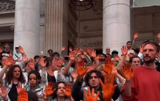 رفع المحتجون خلال الوقفة أيديهم الملطخة باللون الأحمر في إشارة رمزية إلى استمرار الإبادة الجماعية التي يرتكبها الاحتلال بحق أهالي غزة. كما وحملوا الأعلام الفلسطينية ولافتات تطالب بوقف الجرائم الصهيونية، مؤكدين أن الصمت الدولي يشجع الاحتلال على مواصلة عدوانه.