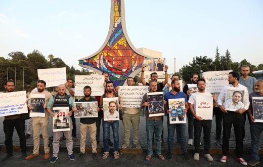 نظم صحفيون في "دمشق"، الاثنين، وقفة احتجاجية مرتدين الدروع الواقية، تنديداً بقتل "إسرائيل" لصحفيين فلسطينيين في قطاع غزة واستذكارًا لزملائهم الذين قضوا في القصف الأخير.