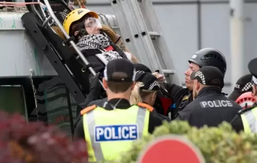 وكان الناشطان من حركة “أغلقوا ليوناردو – إدنبرة” قد أوقفا سيارة عند مدخل مصنع “ليوناردو”، حيث قام أحدهما بالالتصاق بسقف السيارة والآخر داخلها، كما استهدفا المنشأة بزجاجات تحتوي على طلاء أحمر وأخضر في محاولة لمنع الوصول وإغلاق المصنع.