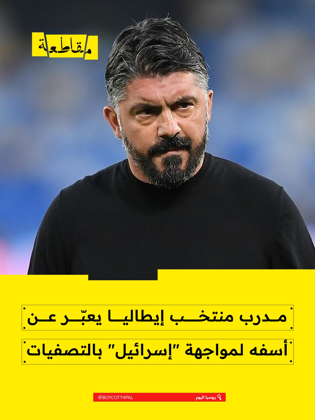 جدد "جينارو غاتوزو"، المدير الفني للمنتخب الإيطالي، تعاطفه مع معاناة المدنيين الفلسطينيين جراء الحرب، معربًا عن أسفه لمواجهة منتخب "إسرائيل" في تصفيات كأس العالم 2026 نتيجة قرعة المواجهات.