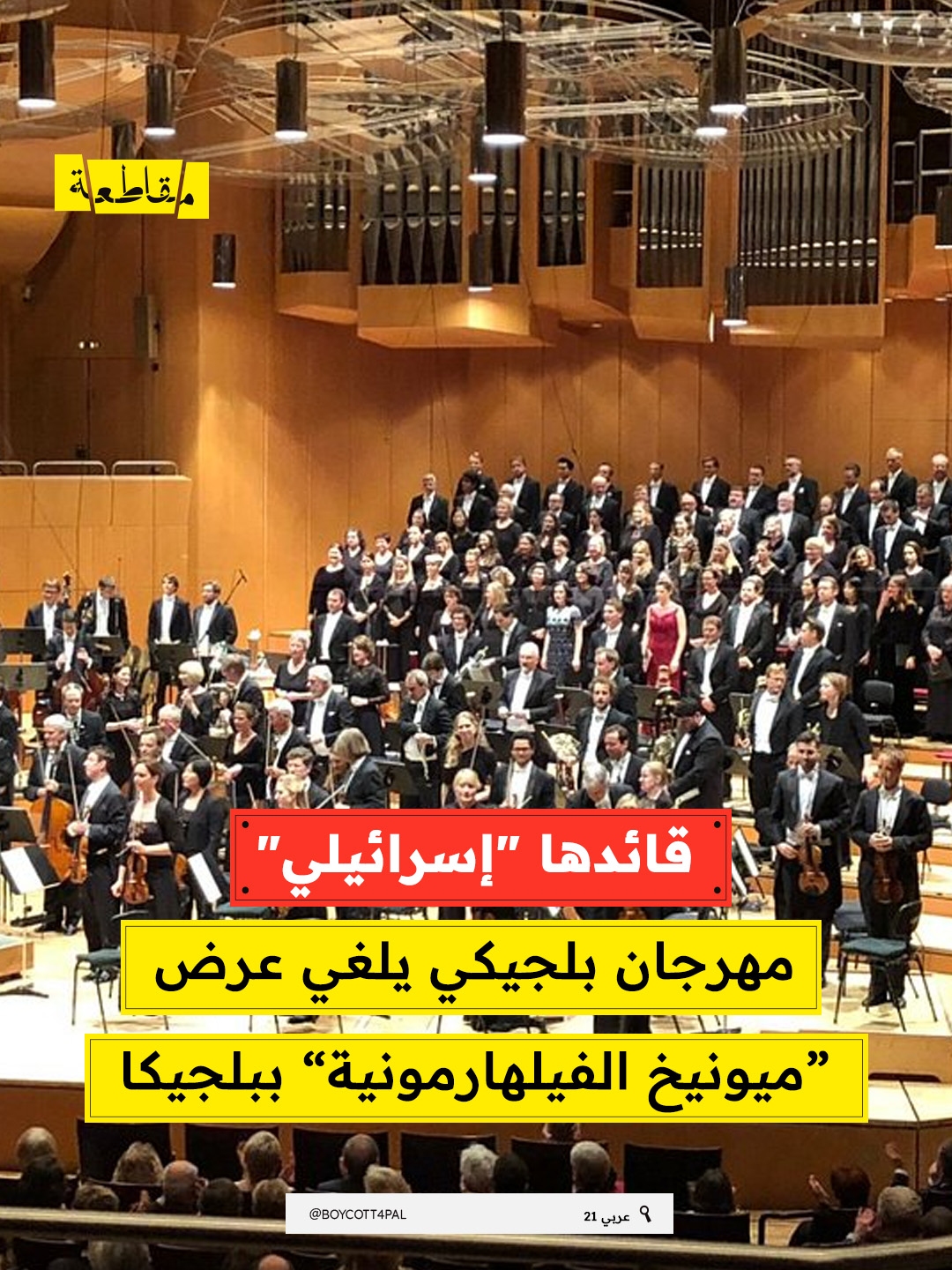 أعلن منظمو مهرجان بلجيكي إلغاء عرض لأوركسترا "ميونيخ الفيلهارمونية" الذي كان مقرراً في 18 سبتمبر الجاري ضمن فعاليات مهرجان “فلاندرز فستيفال غنت”، بسبب ارتباط قائد الفرقة لاهف شاني بالإدارة الموسيقية للأوركسترا الفيلهارمونية الصهيونية.