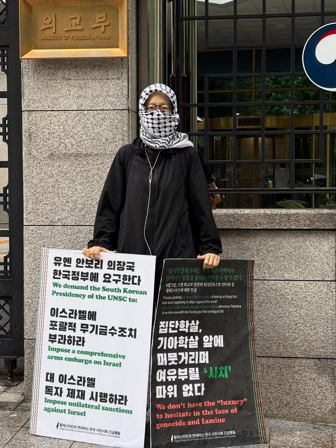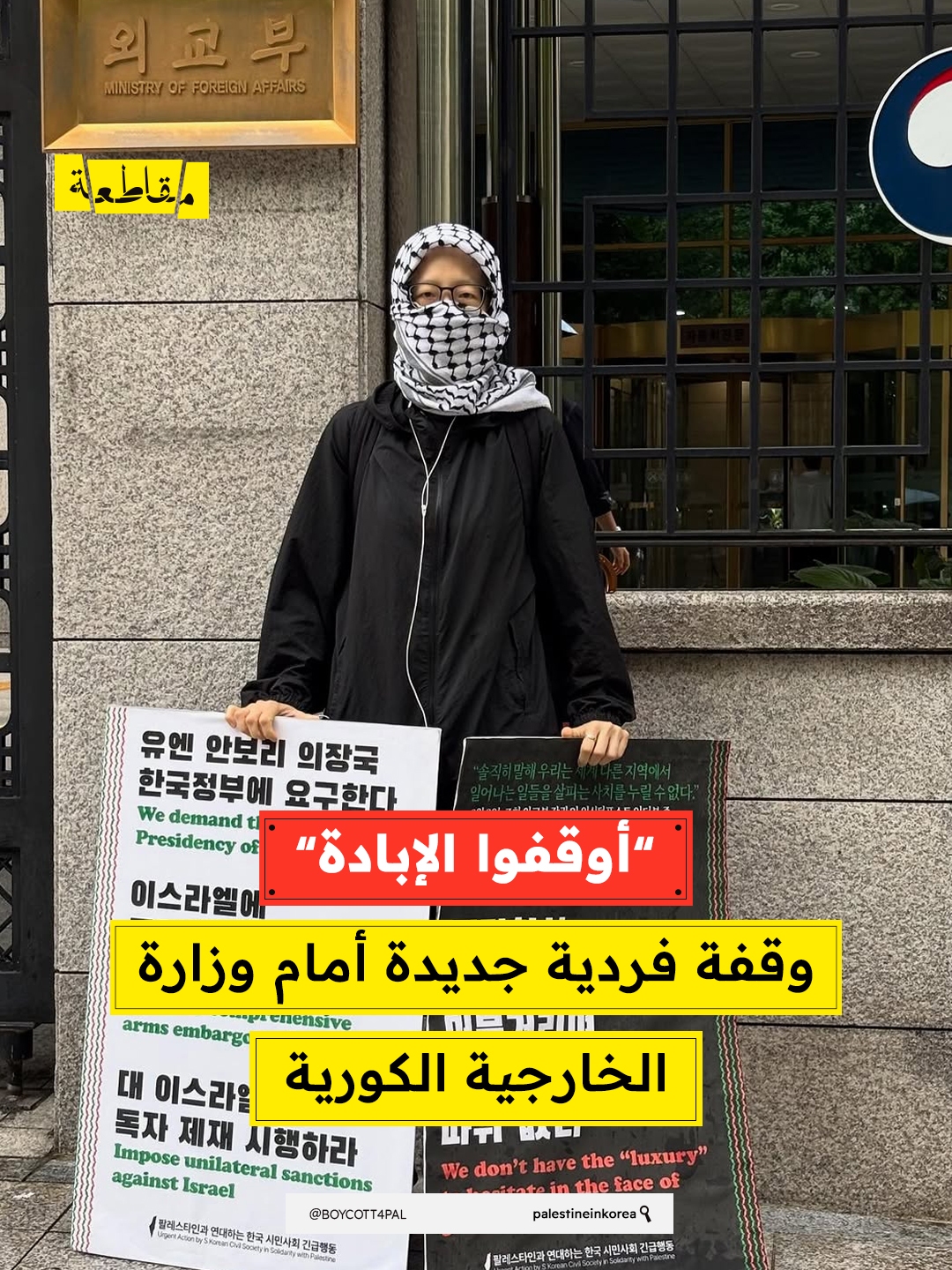 تشهد العاصمة الكورية احتجاجات مستمرة أمام وزارة الخارجية، تضمنت وقفة احتجاجية فردية نظمها نشطاء حقوقيون وفنانون داعمون للقضية الفلسطينية.