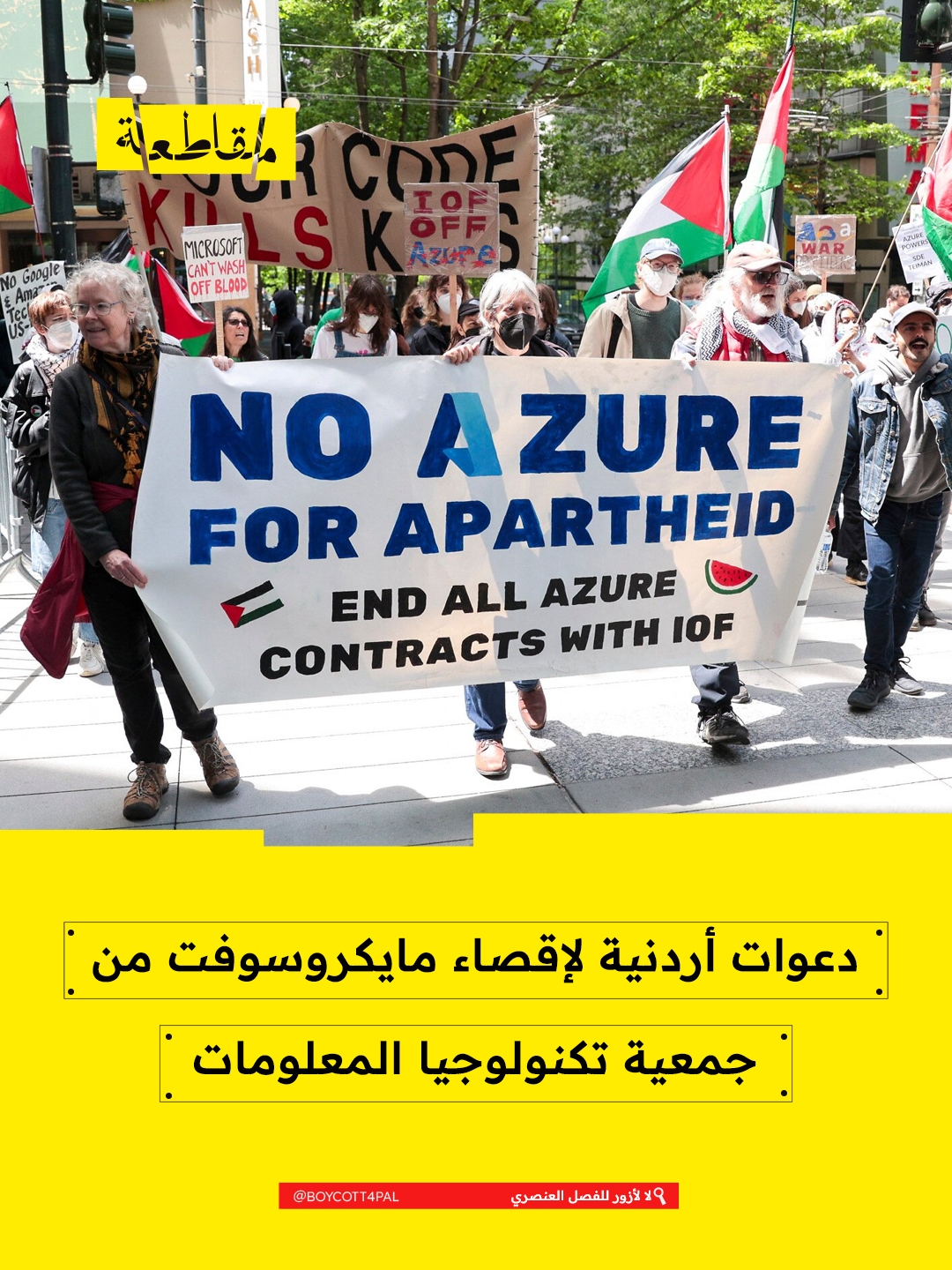 طالب ناشطون أردنيون بإلغاء عضوية شركة مايكروسوفت من جمعية شركات تقنية المعلومات والاتصالات الأردنية (إنتاج). ودعا الناشطون، عبر مواقع التواصل الاجتماعي، والذين دعمتهم مجموعة “لا لأزور للفصل العنصري” مجلس إدارة الجمعية إلى اتخاذ موقف واضح برفض استمرار عضوية مايكروسوفت بسبب تعاونها مع الاحتلال الإسرائيلي، سواء من خلال تقديم خدمات تكنولوجية أو عبر عقود "أزور" الموقعة مع جيش الاحتلال.