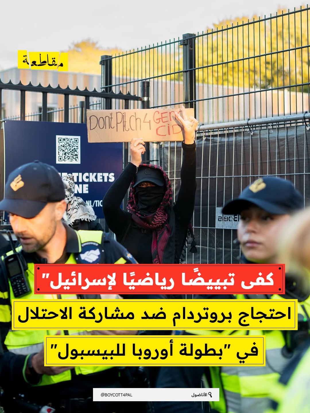 وأكد المتظاهرون رفضهم لاستخدام الرياضة كأداة لتلميع صورة الاحتلال، مشيرين إلى أن مشاركته في البطولات الأوروبية تمثل تطبيعًا للجرائم وتجاهلًا لمعاناة الشعب الفلسطيني الذي يعاني من أبادة جماعية مستمرة وجريمة لتجويع بفعل العدوان والحصار الصهويني.