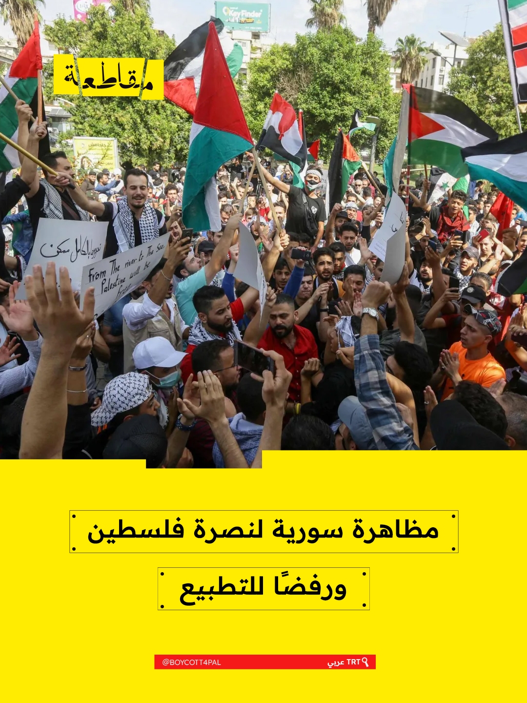 بمشاركة العشرات، تظاهر محتجون أمام قلعة دمشق بالعاصمة السورية، رافعين العلم الفلسطيني ولافتات تضامنية، للتنديد بمجازر الاحتلال الإسرائيلي في غزة ورفض أي اتفاق قد يؤدي إلى تطبيع العلاقات مع الاحتلال.