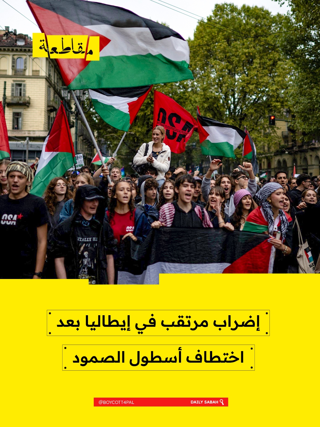 دعت النقابات الإيطالية إلى إضراب عام اليوم الجمعة تضامنًا مع سكان غزة ودعمًا لأسطول الصمود العالمي الذي ينقل مساعدات غذائية وطبية لكسر الحصار الإسرائيلي، وذلك بعد اعتراض القوات الإسرائيلية للسفن، وهو ما أثار موجة من الاحتجاجات في عدة مدن إيطالية.
