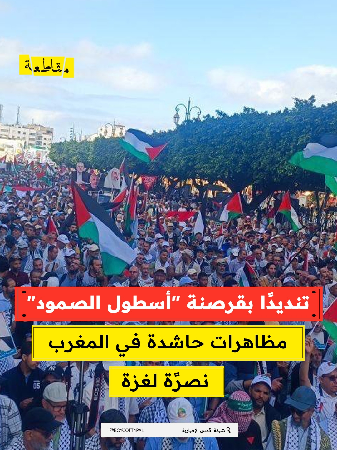 شارك الآلاف في تظاهرة ضخمة بالعاصمة المغربية الرباط، دعمًا لغزة ورفضًا للتطبيع، وتنديدًا بجريمة التجويع والعدوان الصهيوني المستمر على القطاع، واستنكارًا لقرصنة قوات الاحتلال البحرية لأسطول الصمود العالمي الذي كان في طريقه إلى القطاع لكسر الحصار وإيصال المساعدات الإنسانية من مواد غذائية وحليب أطفال وأدوية.