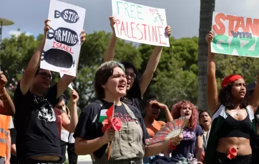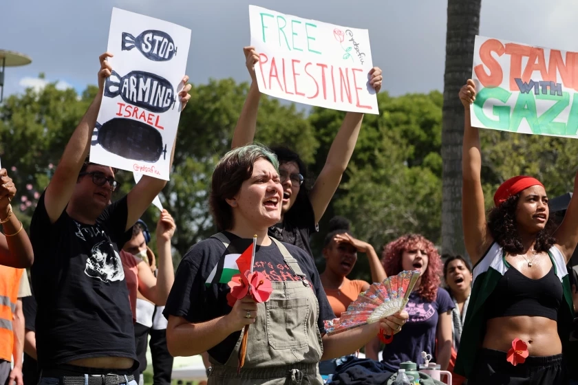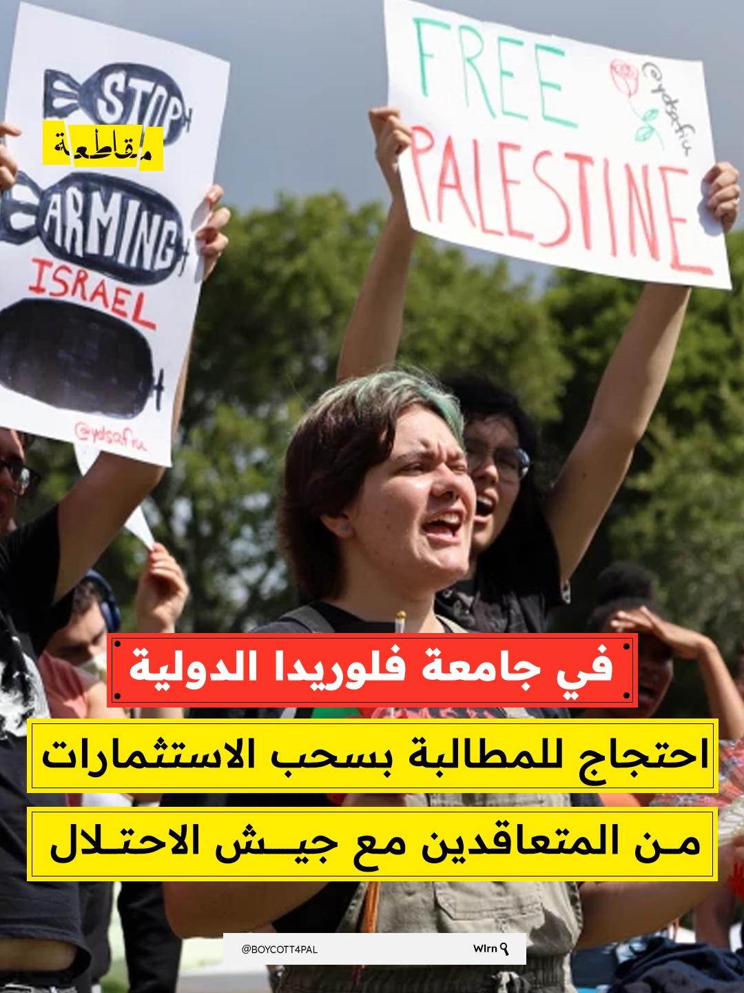 تجمع عشرات الطلاب في جامعة فلوريدا الدولية بعد ظهر أمس الخميس في وقفة احتجاجية، طالبوا خلالها إدارة الجامعة بسحب استثماراتها من الشركات المتعاقدة والممولة للجيش الإسرائيلي.
