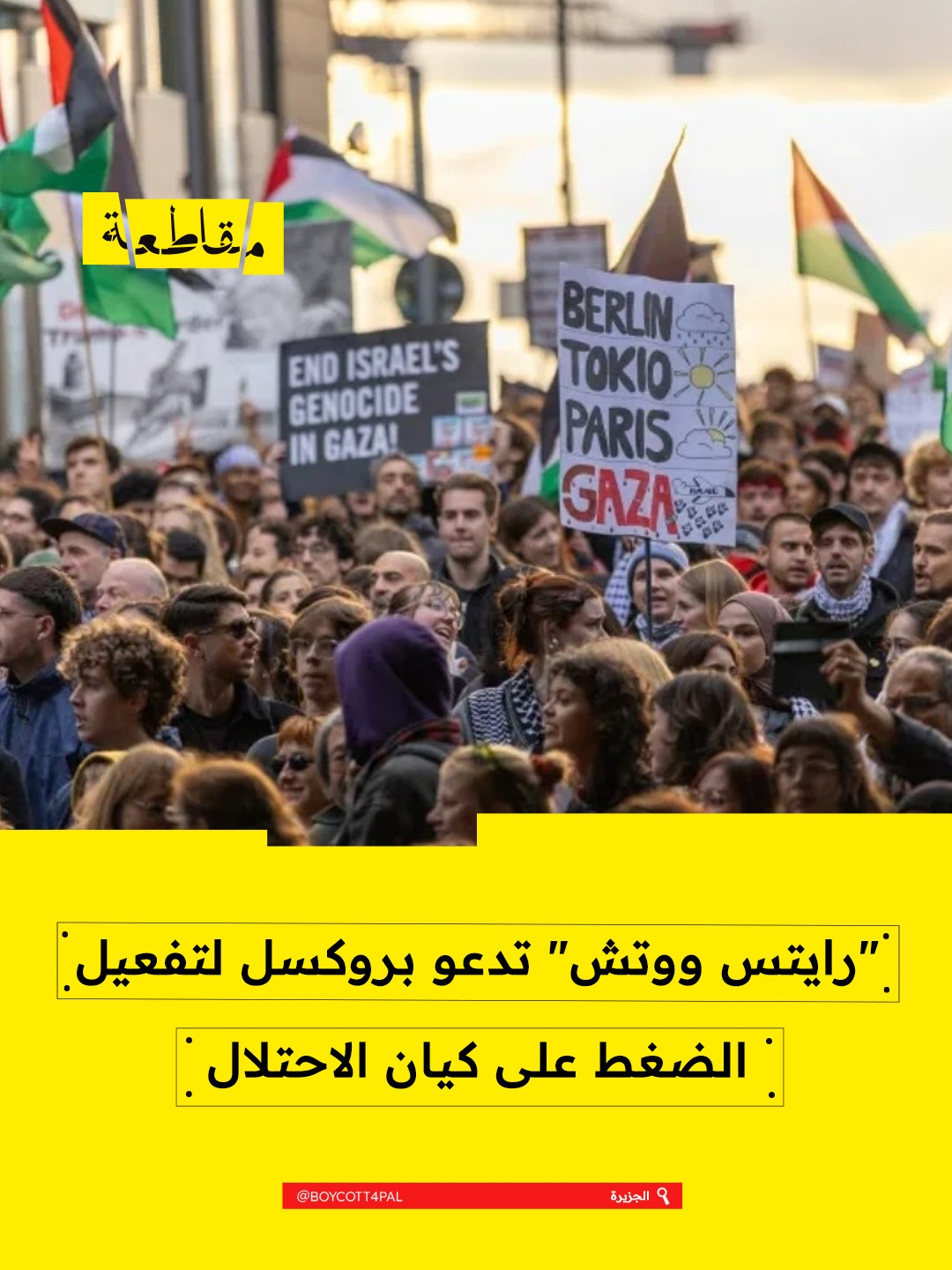 دعت حركة المقاطعة وسحب الاستثمارات وفرض العقوبات (BDS) إلى تصعيد الضغوط الشعبية والسياسية لعزل "إسرائيل"، التي تواصل ارتكاب جرائم إبادة جماعية بحق الشعب الفلسطيني. وطالبت الحركة الحكومات بفرض عقوبات ق