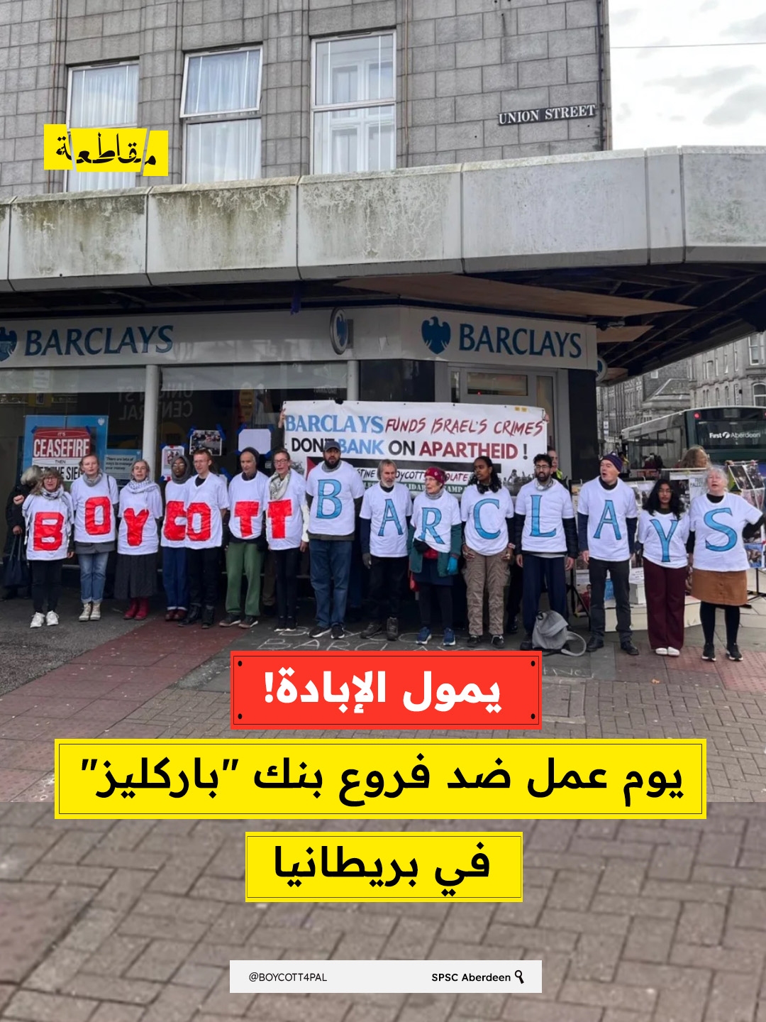 نظم عشرات النشطاء من مجموعة "التضامن مع الشعب الفلسطيني" في بريطانيا احتجاجًا أمام عدّة أفرع لبنك باركليز، ببريطانيا، منها لندن ،مانشستر ،شيفليد ،برمنغهام وبارنسلي، حيث رفع المتظاهرون لافتات تدعو إلى مقاطعة البنك، وعرضوا صورًا للشهداء الفلسطينيين الذين استشهدوا في حرب الإبادة التي شنها الاحتلال على غزة لمدة عاميين.