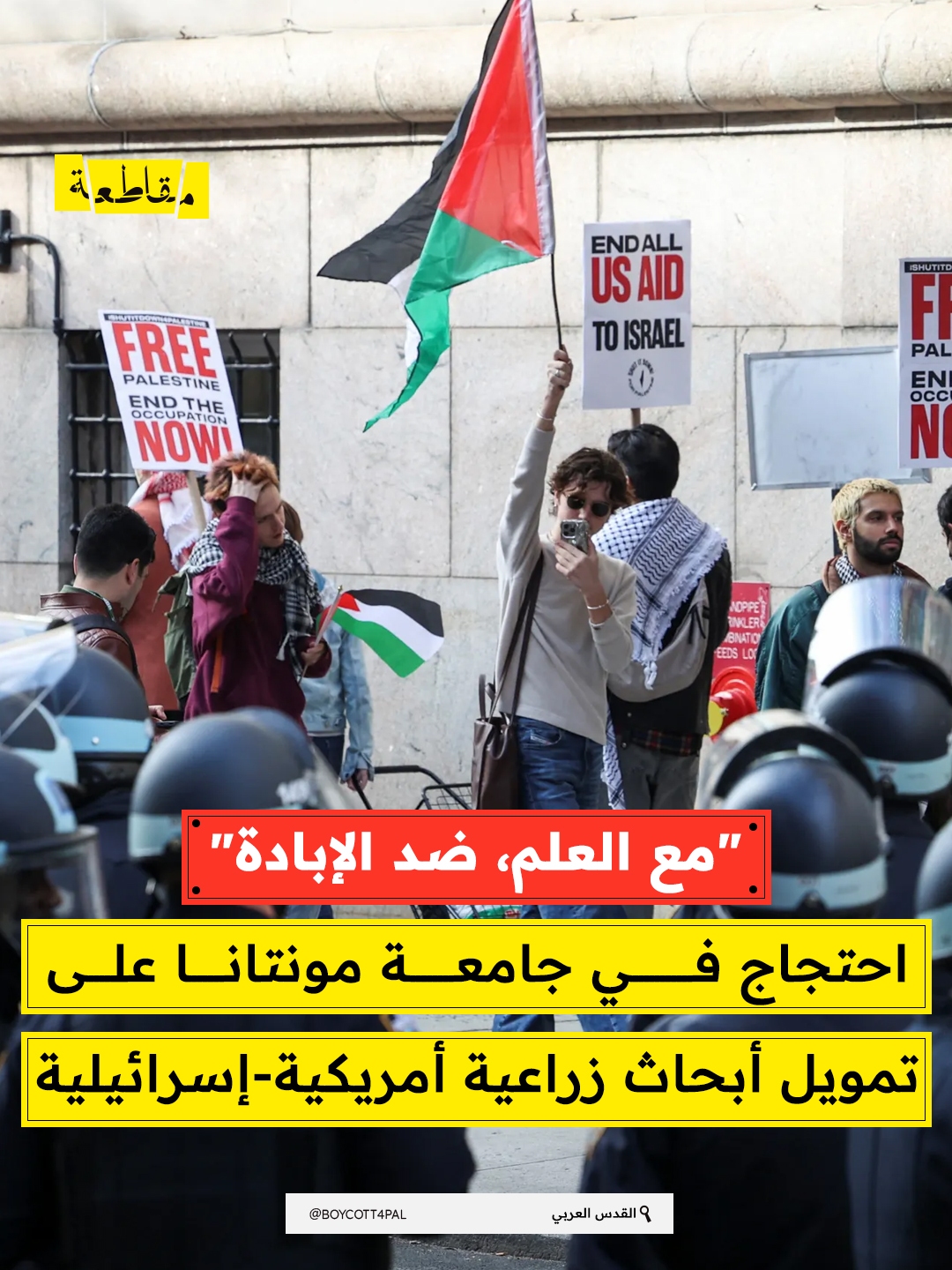 شهدت جامعة ولاية مونتانا احتجاجًا طلابيًا ومجتمعيًا على حضور جلسة تعريفية لصندوق البحث الزراعي المشترك الأمريكي-الإسرائيلي (BARD)، المخصص لتجنيد باحثين جامعيين لإجراء أبحاث زراعية لصالح الصندوق. ورفع المشاركون لافتات كتب عليها: “المال القاتل خارج الحرم الجامعي” و”مع العلم ضد الإبادة”.
