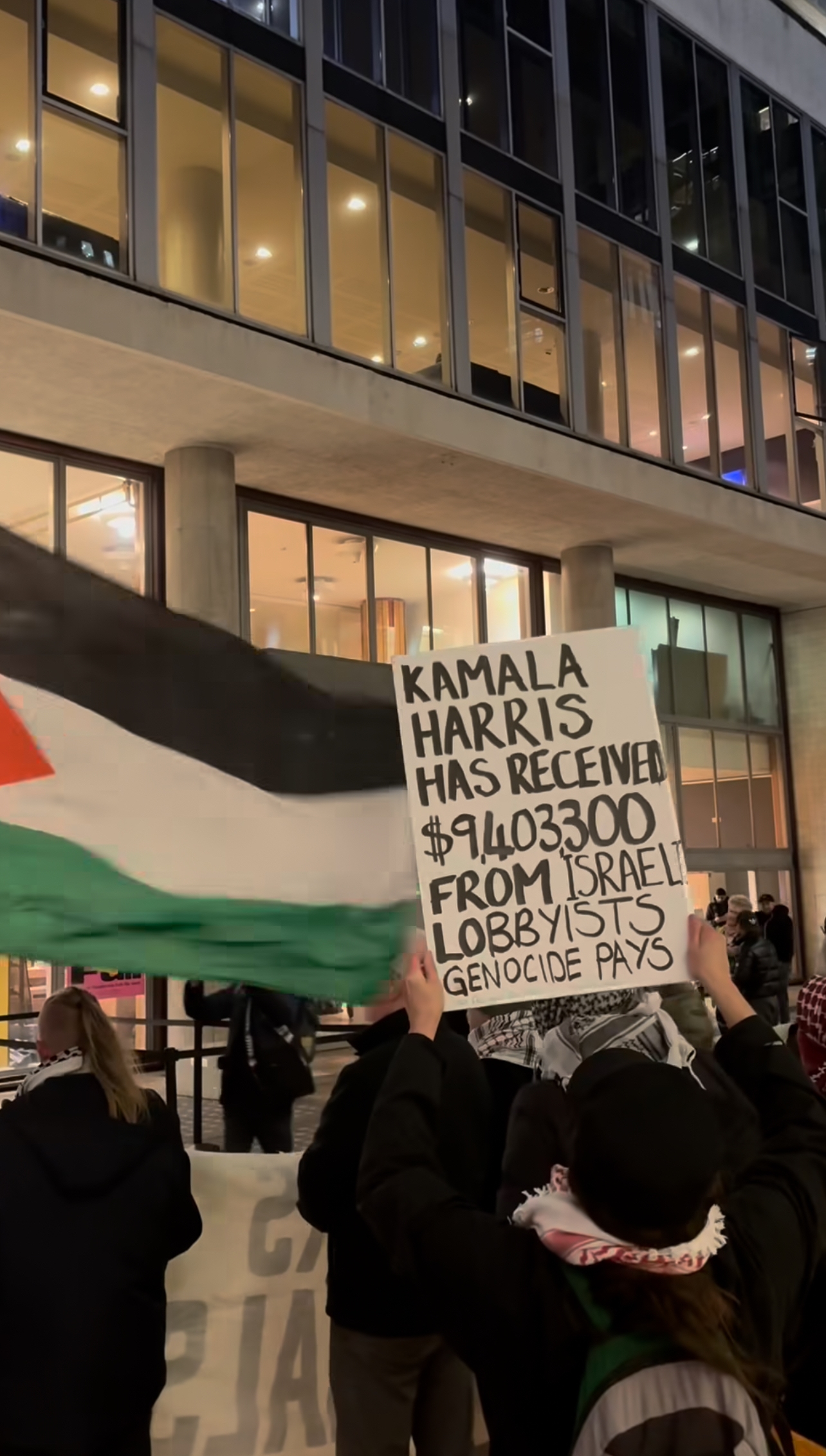 ورفع المحتجون لافتات ورددوا شعارات مناهضة لهاريس، أبرزها: “ليُطرد مجرمو الحرب!” و “عرقلوهم جميعًا!”، مطالبين بمحاسبة المسؤولين الأمريكيين المتورطين في دعم الاحتلال بالسلاح والتمويل.