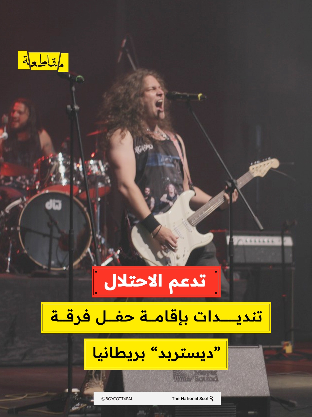 ند نشطاء فلسطينيون في بريطانيا واسكتلندا بإعلان إقامة حفل فرقة الميتال الأمريكية “ديستربد” في قاعة أوفو هيدرو بتاريخ 28 أكتوبر، مشيرين إلى أن الفرقة تدعم الاحتلال وتشارك بشكل مباشر في جرائم الإبادة الجماعية في غزة.