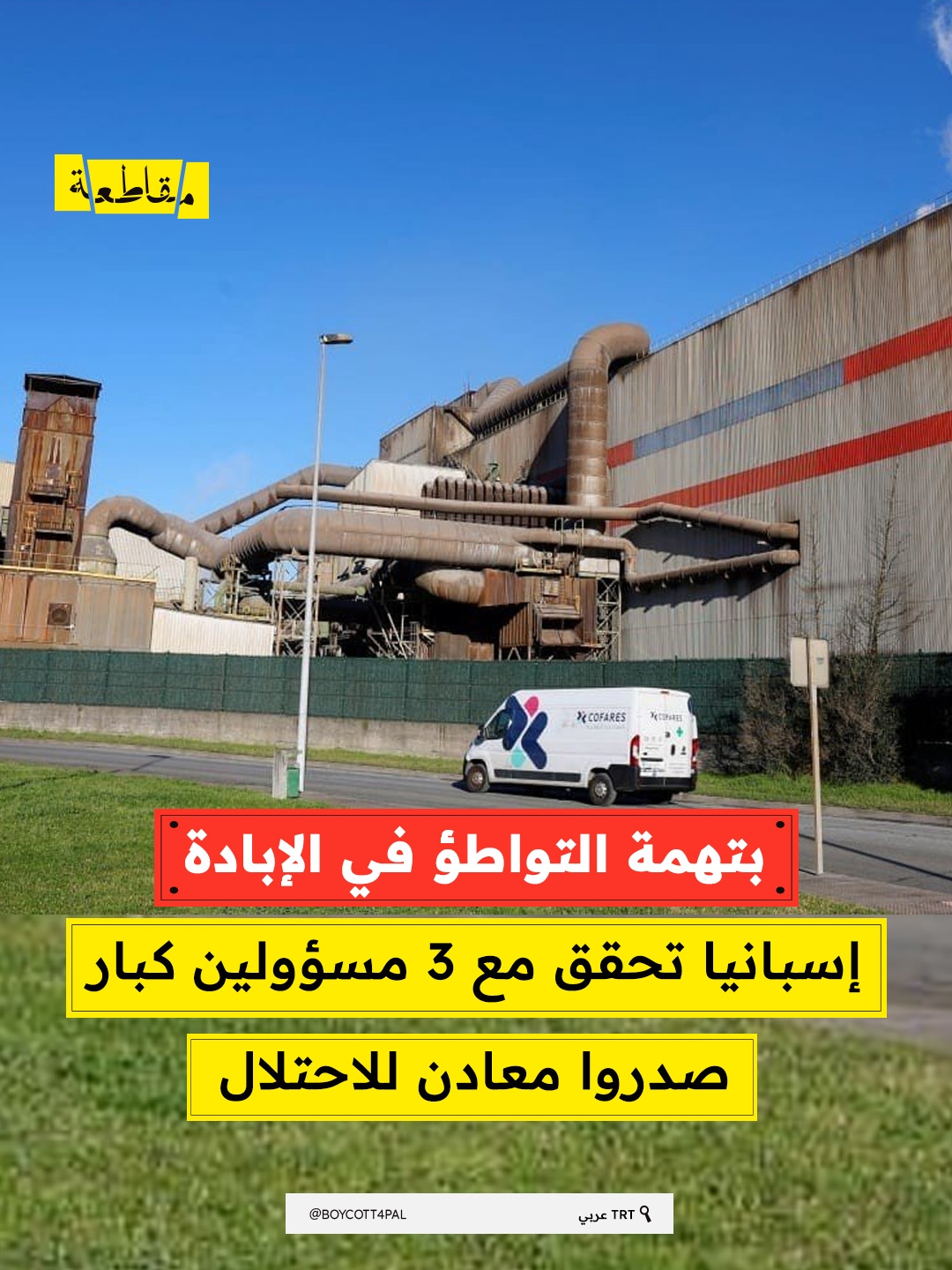 أعلنت المحكمة الوطنية الإسبانية يوم أمس الجمعة 24 أكتوبر عن فتح تحقيق بحق 3 أشخاص من المسؤولين التنفيذيين في شركة سيدينور لصناعة الصلب، بقضية التواطؤ في جرائم ضد الإنسانية( جرائم الإبادة الجماعية)، وذلك على خلفية تعاملهم مع شركة أسلحة صهيونية.
