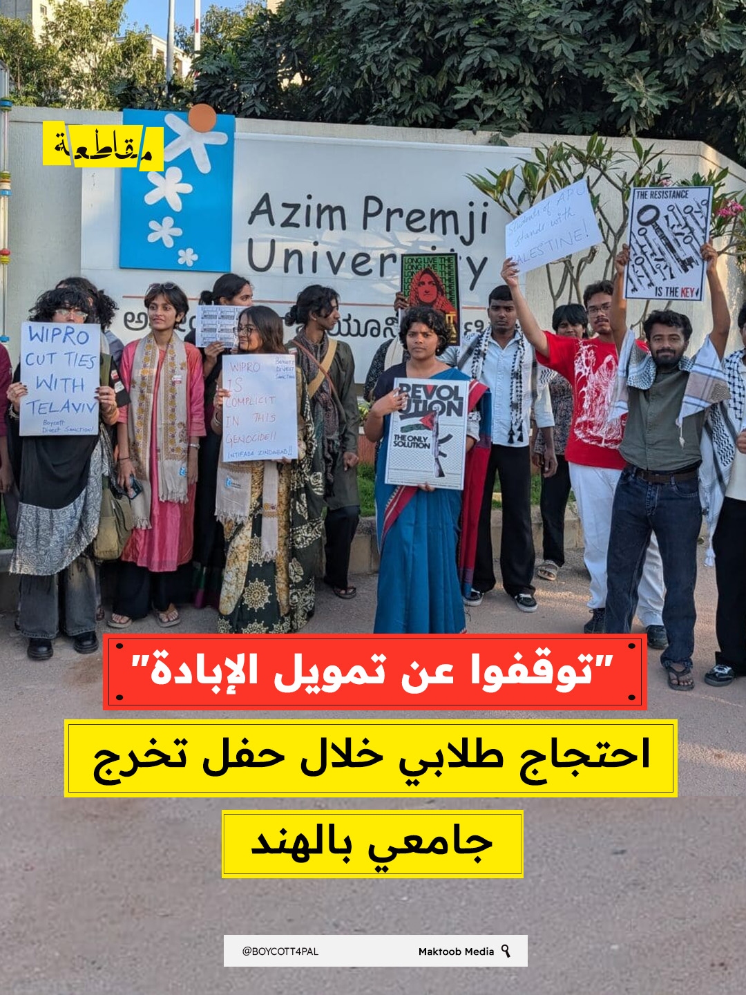 شهد حفل تخرج جامعة أزيم بريمجي في مدينة بنغالور، الهند ، يوم السبت 25 أكتوبر احتجاجًا طلابيًا على مشاركة شركة وِيبرو مع المتواطئة مع الاحتلال، حيث ارتدى الطلاب ملصقات تطالب بإنهاء أي علاقة بين الشركة و"إسرائيل"، تعبيرًا عن تضامنهم مع الشعب الفلسطيني ورفضًا لجرائم الإبادة في غزة.