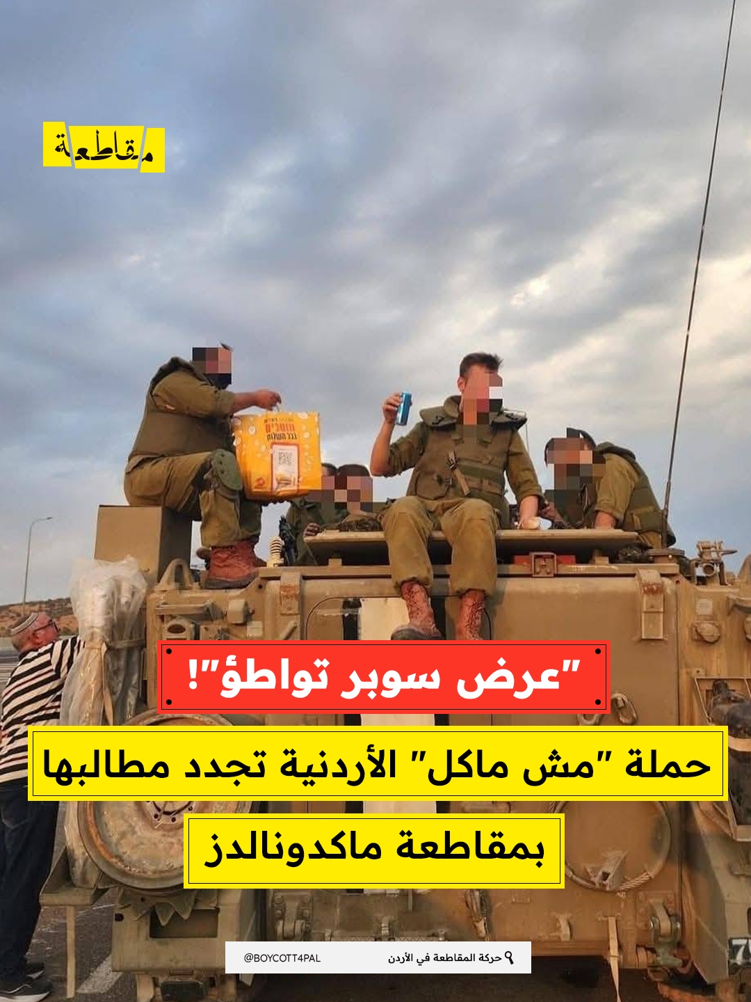 جددت حركة المقاطعة في الأردن، بالتعاون مع الحملة المنظمة “مش ماكل”، دعوتها لمقاطعة ماكدونالدز، وذلك بسبب تواطئه مع الاحتلال عبر تزويد جنوده بوجبات مجانية أثناء ارتكابهم حرب الإبادة بحق أهلنا في القطاع.