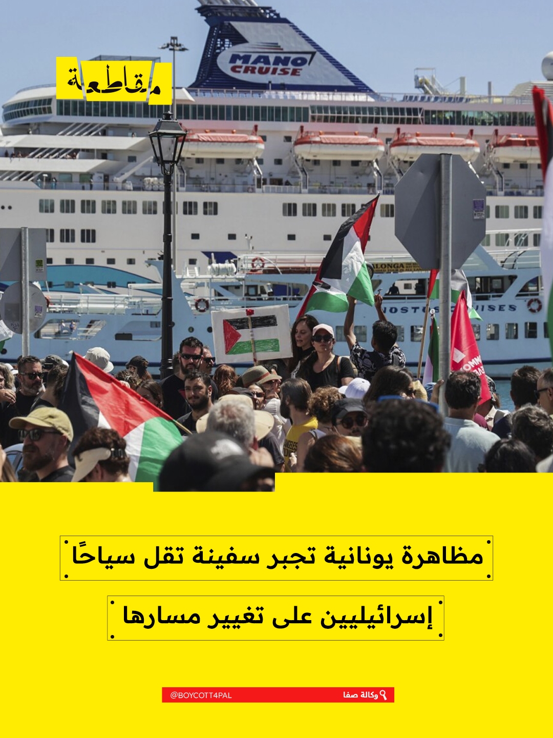 تظاهر عشرات المتضامنين مع فلسطين في ميناء "باترا" جنوبي اليونان، احتجاجًا على وصول السفينة السياحية "كراون آيريس" التي كانت تقل سياحًا إسرائيليين، ما دفعها إلى تغيير وجهتها نحو ميناء "كاتاكولوس".