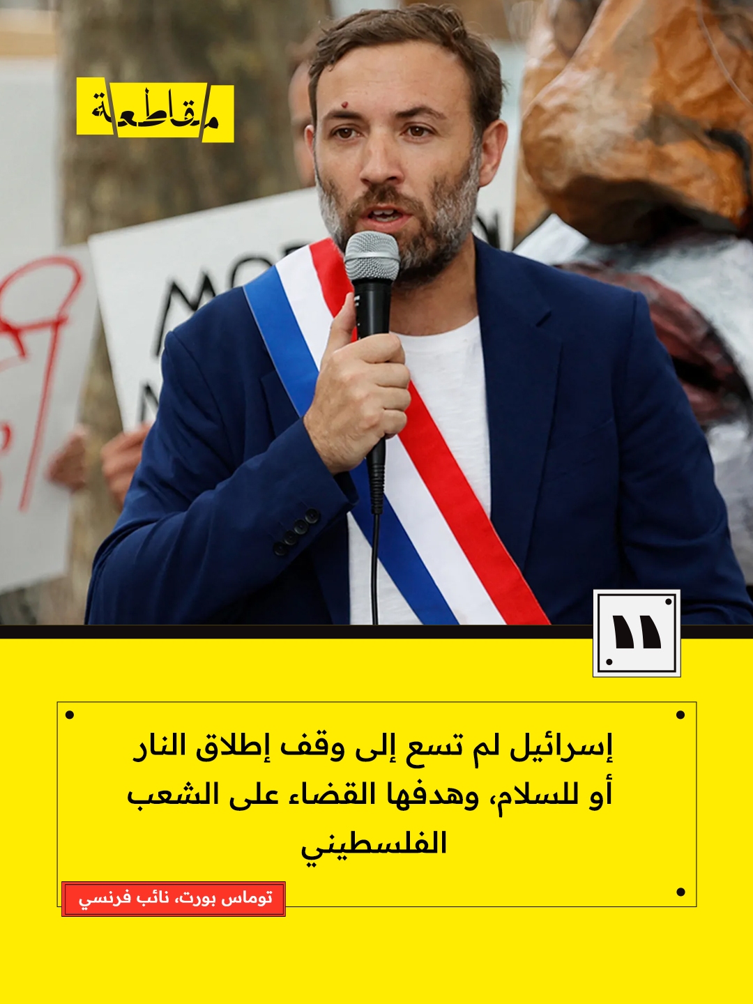 وأكد بورت أن "فرنسا والبرلمان الفرنسي لن يكونا متواطئين في المذبحة الجارية"، مشددًا على رفضه للصمت الدولي إزاء الجرائم الصهيونية المستمرة بحق الفلسطينيين العزّل في غزة.