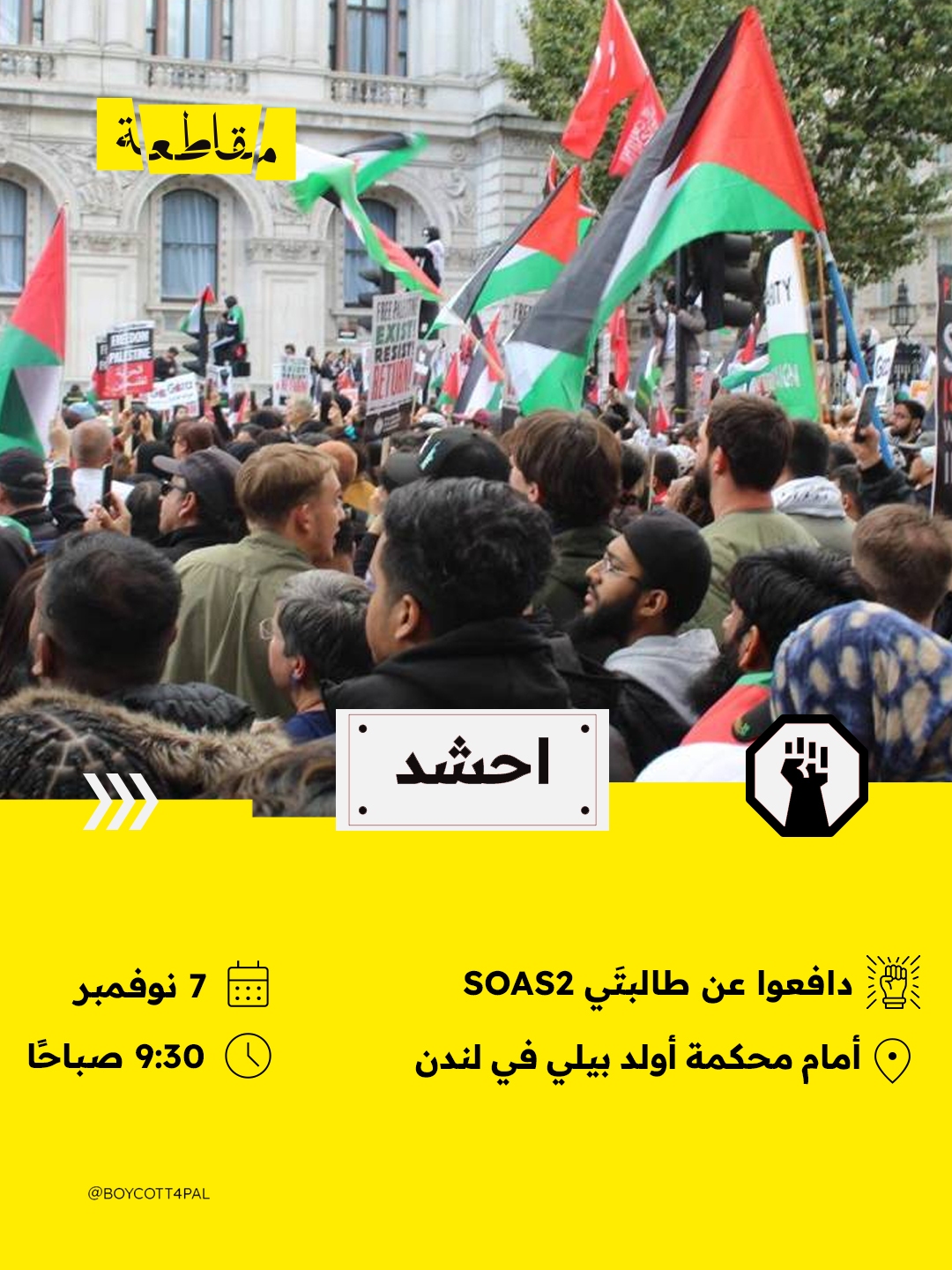 دعت حملة “دافعوا عن طالبتَي SOAS2” إلى وقفة تضامنية يوم الجمعة 7 نوفمبر أمام محكمة أولد بيلي في لندن، بالتزامن مع جلسة محاكمة الطالبة سارة، إحدى طالبتي جامعة SOAS اللتين تواجهان اتهامات بموجب "قوانين الإرهاب" البريطانية على خلفية مواقفهما الداعمة لفلسطين.