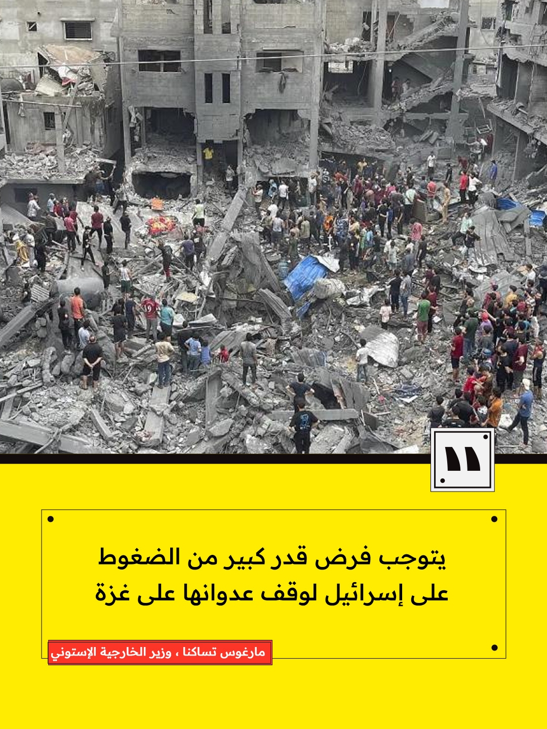 قال وزير الخارجية الإستوني مارغوس تساكنا إن “الوضع الإنساني في غزة كارثي ويتوجب فرض قدر كبير من الضغوط على إسرائيل لوقف المعاناة المستمرة هناك”، مؤكدًا أن بلاده تدعم حل الدولتين وقرارات الأمم المتحدة ذات الصلة، وقد وقّعت على إعلان نيويورك الذي دعا إلى تحقيق سلام عادل ودائم بين الفلسطينيين والإسرائيليين.