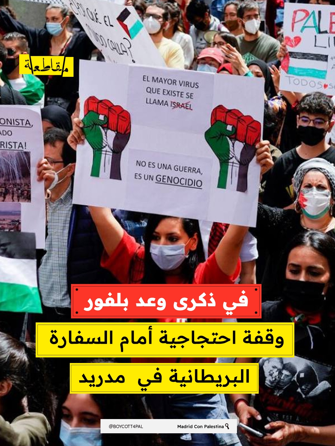احتج عشرات المتضامنين مع فلسطين أمام السفارة البريطانية في مدريد احتجاجًا على أكثر من 100 عام من الاستعمار البريطاني لفلسطين، وذلك بتنظيم من حركة Madrid con Palestina.