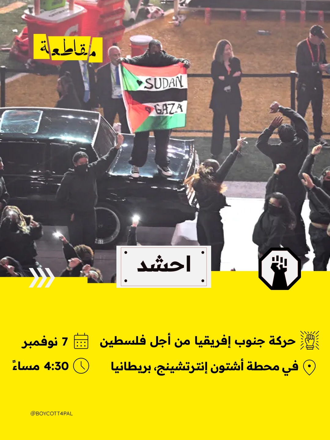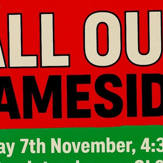دعت حركة جنوب إفريقيا من أجل فلسطين (South Africa Palestine Movement) إلى تنظيم وقفة تضامنية في تيمسايد البريطانية يوم الجمعة 7 نوفمبر/تشرين الثاني 2025 عند الساعة 4:30 مساءً في محطة أشتون إنترتشينج ، دعمًا للشعبين الفلسطيني والسوداني.
