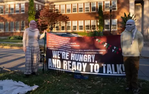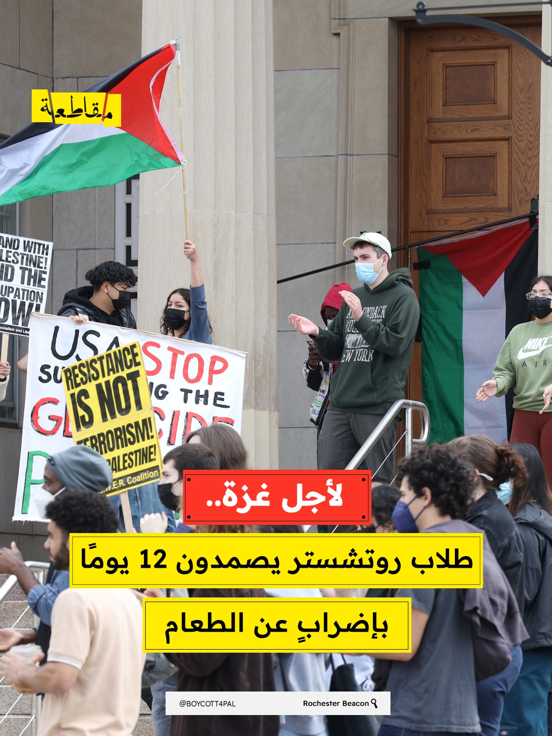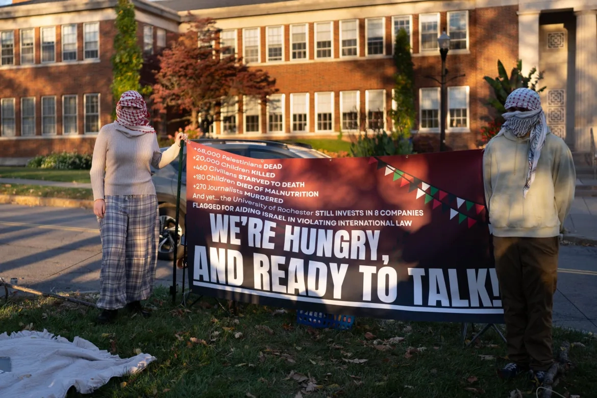 بعد اثني عشر يومًا من الإضراب عن الطعام، أعلن طلاب جامعة روتشستر انتهاء حركتهم الاحتجاجية التي هدفت إلى دفع إدارة الجامعة للحوار حول داعمي فلسطين في الحرم الجامعي، والوضع الإنساني في غزة.