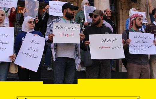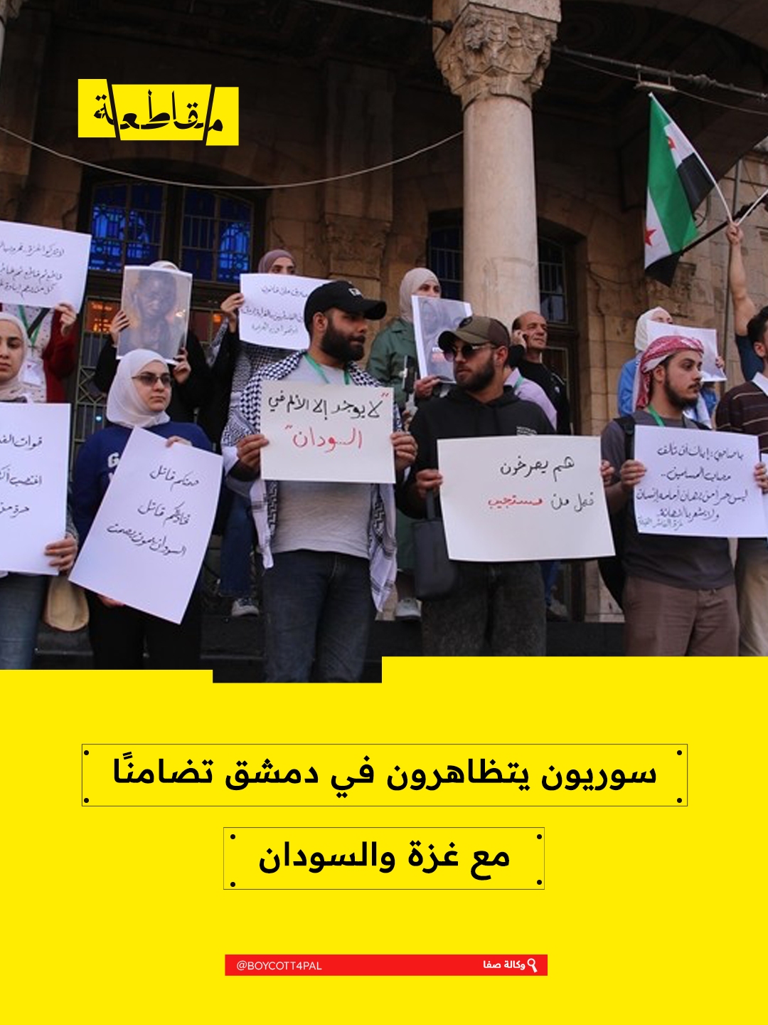 نظم عشرات الأشخاص في العاصمة السورية دمشق وقفة تضامنية مع كل من الفلسطينيين بقطاع غزة والشعب السوداني. وتجمع المشاركون، أمس الخميس، في "ساحة الحجاز" رافعين لافتات عليها عبارات تدعو إلى مساندة غزة والوقوف إلى جانب الشعب السوداني. وردد المتظاهرون شعارات داعمة للشعبين الفلسطيني والسوداني، ورفعوا الكوفية الفلسطينية وأعلام السودان.