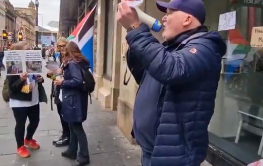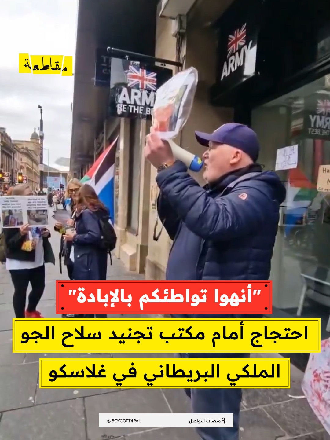نظم ناشطون في مدينة غلاسكو بأسكتلندا وقفة احتجاجية أمام مكتب تجنيد سلاح الجو الملكي البريطاني، للتنديد بمشاركة القوات الجوية البريطانية في جرائم الإبادةالتي تُرتكب في غزة.
