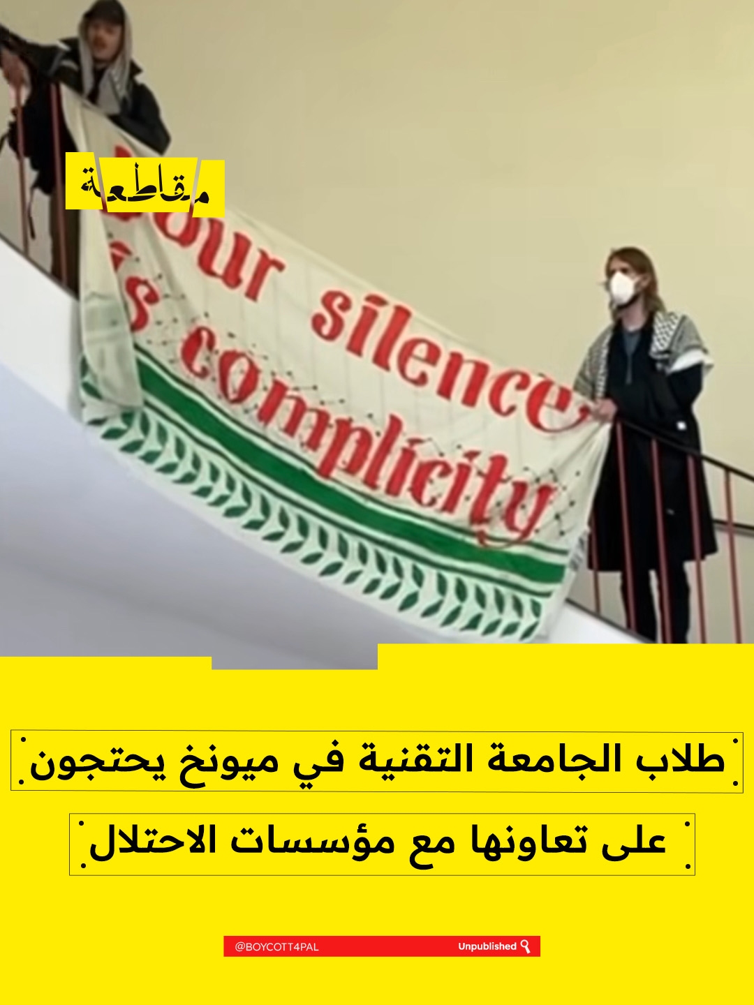 نظّم طلاب في الجامعة التقنية بمدينة ميونخ الألمانية اعتصامًا داخل الحرم الجامعي وخارجه، احتجاجًا على تعاون الجامعة مع مؤسسات إسرائيلية تشارك في تطوير التكنولوجيا العسكرية داخل المستوطنات غير الشرعية.