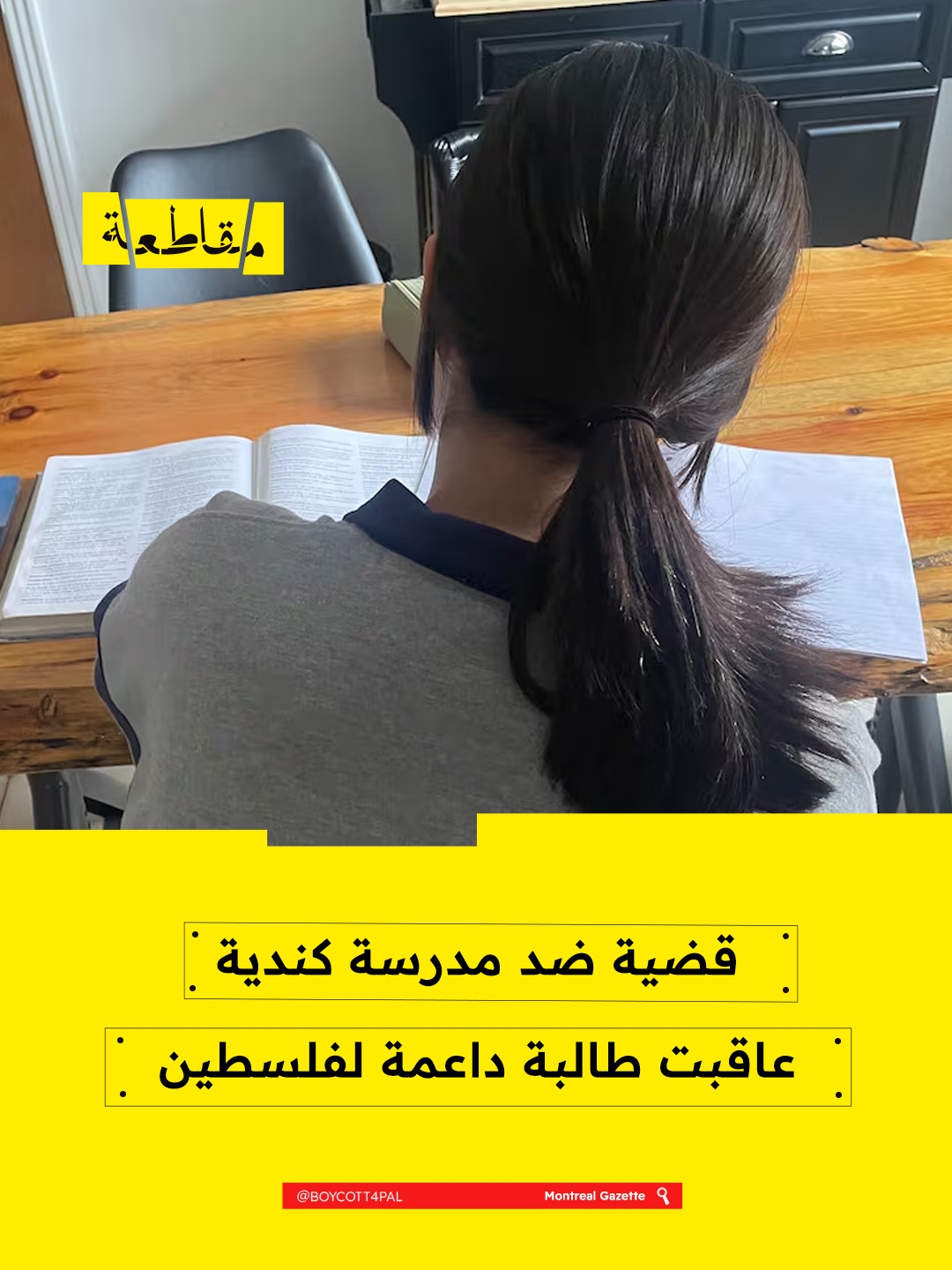 أعلنت أسرة طالبة في مدرسة مونتريال ويست الثانوية عن نيتها رفع شكوى إلى محكمة حقوق الإنسان في كيبيك بعد أن عاقبت المدرسة ابنتهم، البالغة من العمر 17 عامًا، بسبب منشورات على حسابها الخاص على إنستغرام دعمت فيها فلسطين.