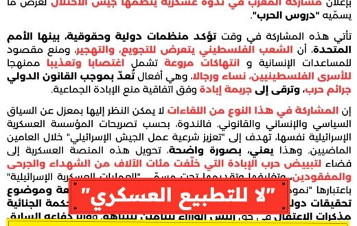 أعلنت "حركة المقاطعة" بالمغرب رفضها التام لمشاركة المغرب في ندوة عسكرية ينظمها الجيش الصهيوني، مشيرة إلى أنها محاولة لتبييض جرائم الاحتلال في قطاع غزة.