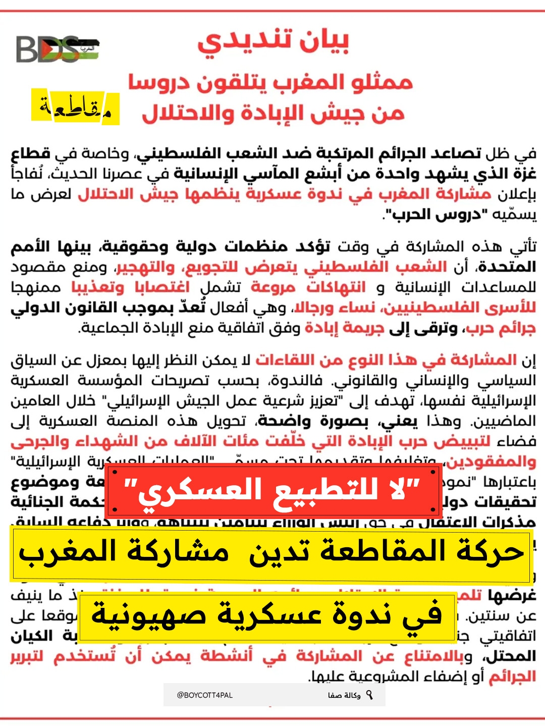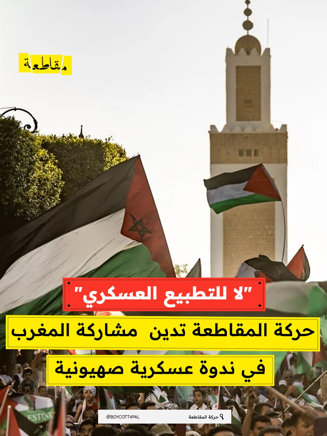"لا للتطبيع العسكري" .. حركة المقاطعة تدين مشاركة المغرب في ندوة عسكرية صهيونية