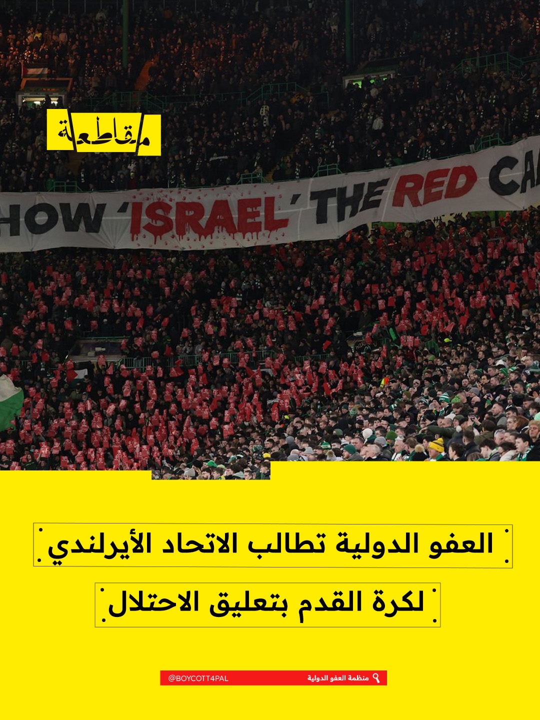 دعت منظمة العفو الدولية الاتحاد الأيرلندي لكرة القدم في أيرلندا الشمالية إلى الانضمام رسميًا إلى التحركات الدولية المطالِبة بتعليق عضوية الاتحاد الإسرائيلي لكرة القدم في الاتحادين الأوروبي والدولي، وذلك بعد التصويت "التاريخي" الذي أجراه الاتحاد الأيرلندي لكرة القدم نهاية الأسبوع الماضي لتبنّي هذا المطلب.