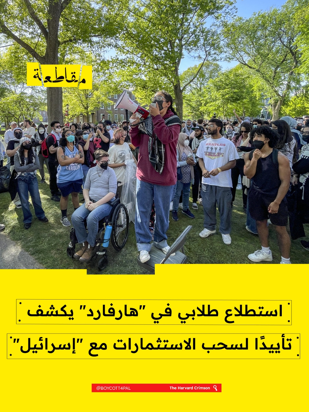 أظهر استطلاع أجرته "جمعية طلاب هارفارد" أنّ غالبية المشاركين من طلاب المرحلة الجامعية يؤيدون سحب استثمارات الجامعة من الشركات والمؤسسات المتواطئة مع "إسرائيل"، والكشف عن طبيعة هذه الاستثمارات.