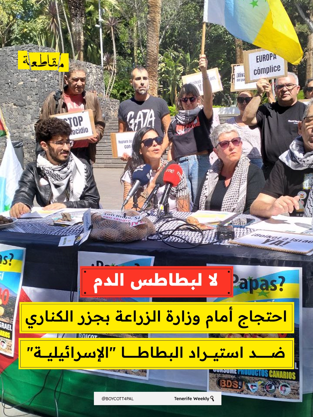 وجاءت هذه الخطوة بالتزامن مع مظاهرة أمام مكاتب الوزارة في سانتا كروز دي تينيريفي تحت شعار “بطاطس؟ نعم للموجو، لا للدم”، بمشاركة أربع منظمات هي: حركة BDS، و”العاملون الصحيون من أجل فلسطين”، و”منصة تينيريفي من أجل فلسطين”، والجمعية الطلابية.