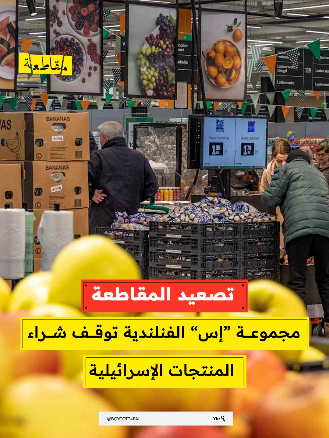 أعلنت مجموعة "إس"، إحدى أكبر سلاسل تجارة البقالة في فنلندا، أنها أوقفت مؤقتًا شراء المنتجات الإسرائيلية، مع التزامها بالمتطلبات القانونية النافذة. وأوضحت المجموعة في بيان لهيئة الإذاعة الفنلندية أن هذا القرار يأتي استجابة لتوصية صادرة عن المفوضية الأوروبية بتعليق البنود المتعلقة بالتجارة في اتفاقية الشراكة بين الاتحاد الأوروبي وكيان الاحتلال.