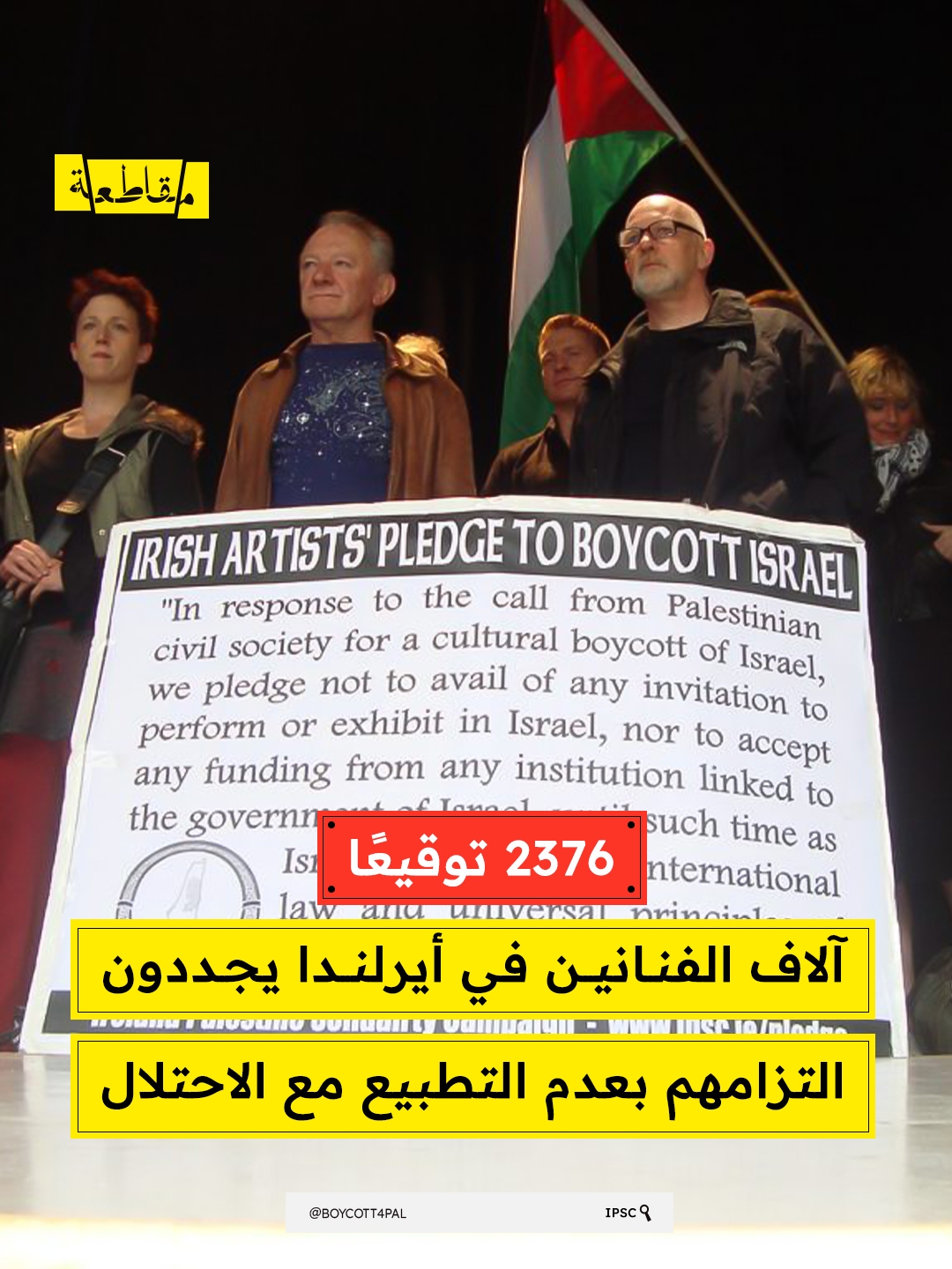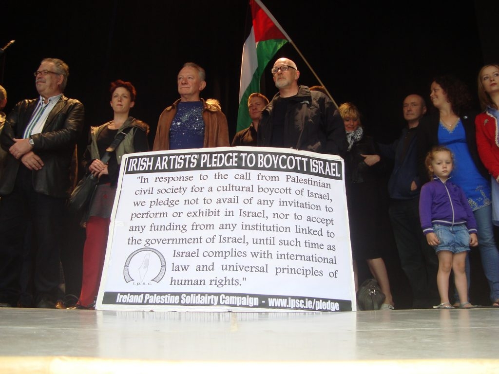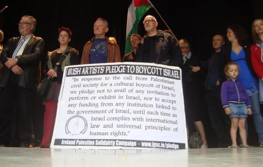 أطلقت حملة التضامن الأيرلندي مع فلسطين (IPSC) في أغسطس 2010 تعهّدًا ثقافيًا وقّعه بداية أكثر من 140 فنانًا أيرلنديًا، ووصل اليوم إلى 2,376 توقيعًا من فنانين وعاملين في الحقل الثقافي. ويتعهد الموقعون بعدم المشاركة في أي عروض أو معارض داخل "إسرائيل"، أو قبول أي تمويل من مؤسسات مرتبطة بالحكومة الإسرائيلية، إلى حين التزام الاحتلال بالقانون الدولي ومبادئ حقوق الإنسان.