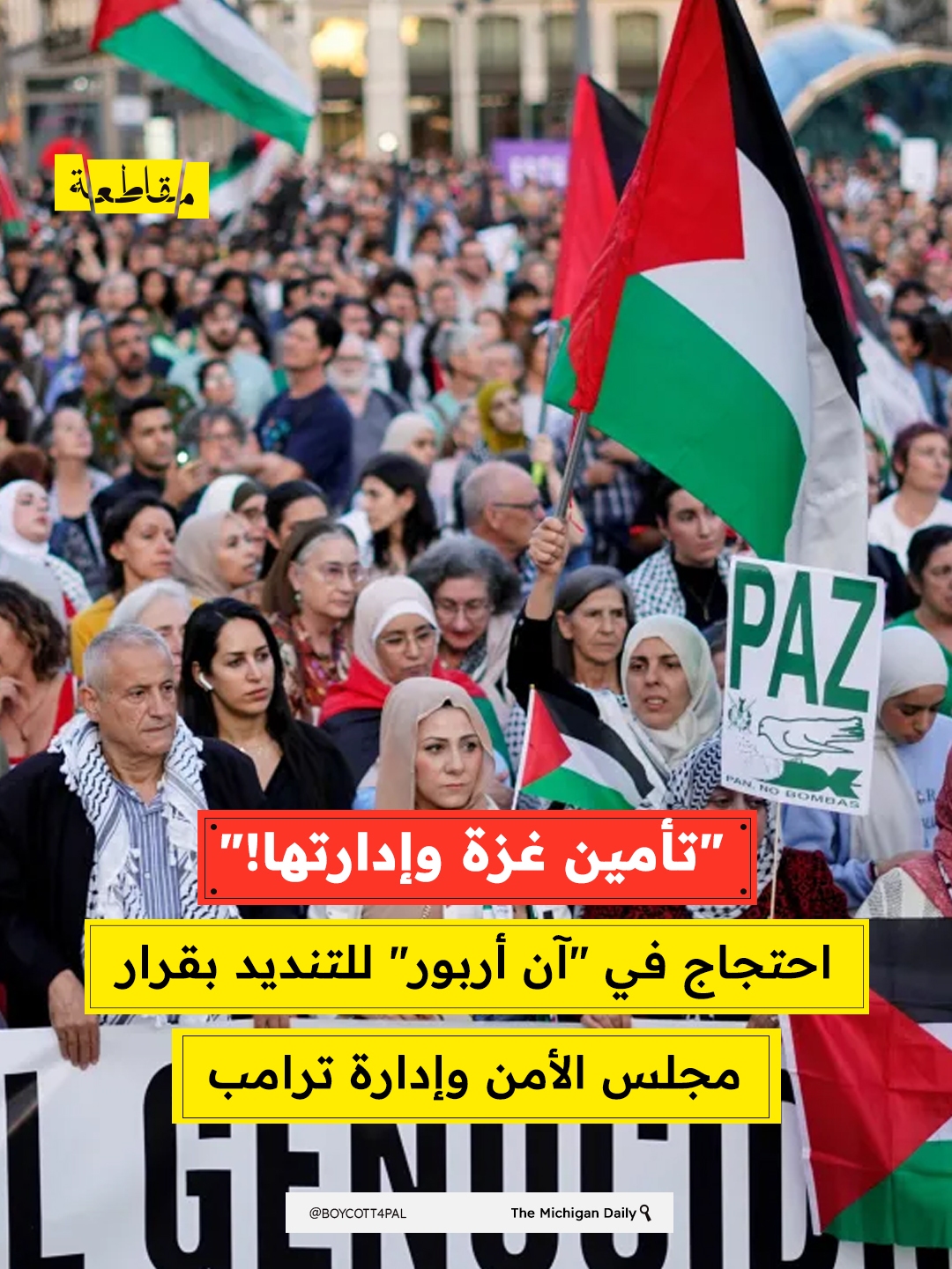 ظاهر نحو أربعين شخصًا أمس الخميس في مدينة آن أربور احتجاجًا على قرار مجلس الأمن رقم 2803، الذي دفعته الولايات المتحدة وصادقت عليه الأمم المتحدة هذا الأسبوع، متبنّيًا خطة الرئيس الأميركي السابق دونالد ترامب المؤلفة من 20 بندًا بشأن “تأمين غزة وإدارتها”.