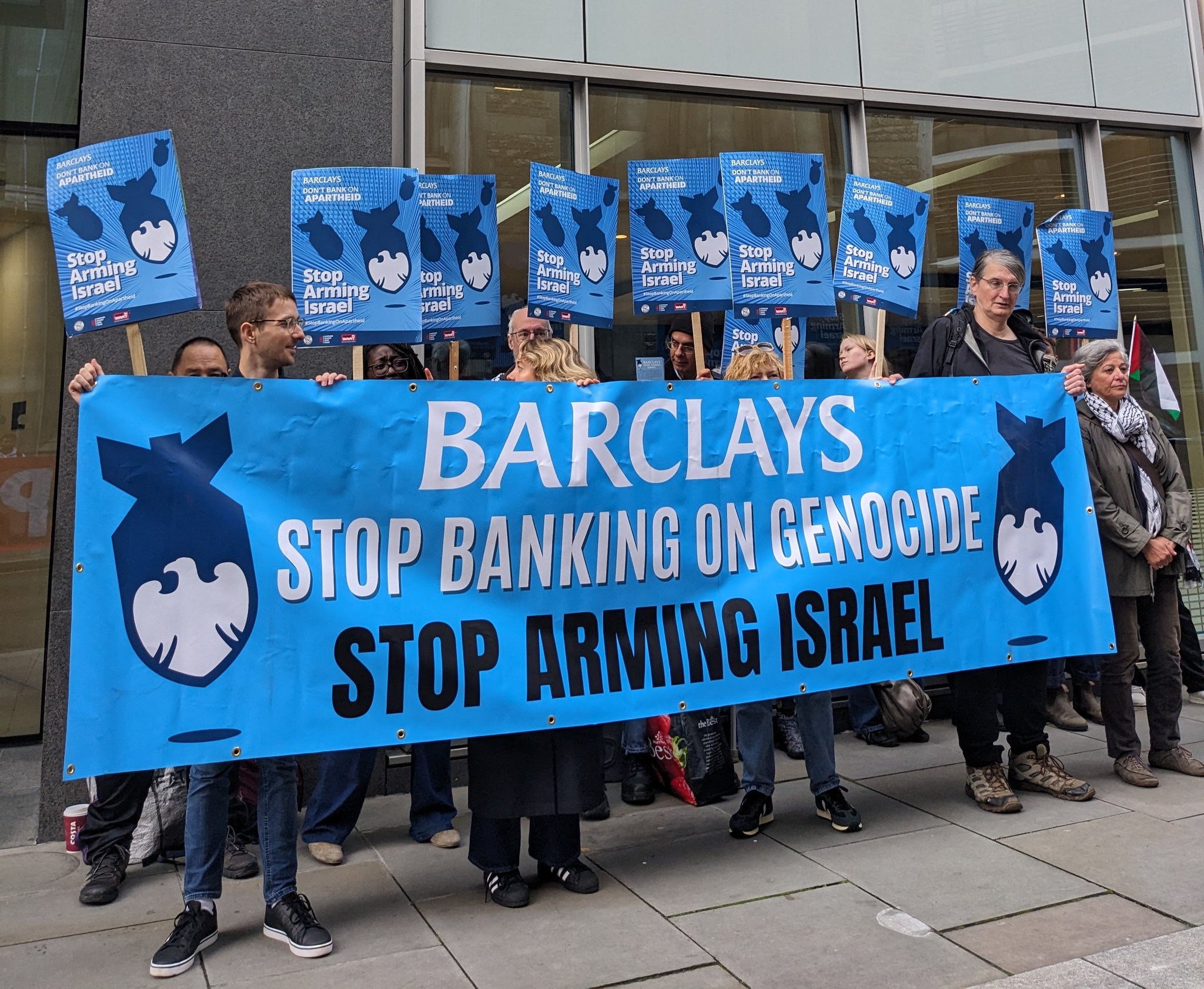 حيث نظم نشطاء احتجاجًا قبل التوجه إلى المظاهرة الوطنية في إدنبرة، تحت شعار “مقاطعة باركليز – بنك الإبادة الجماعية”، للتنديد بدعم البنك للشركات والمؤسسات الصهيونية المتورطة في الانتهاكات والجرائم بحق الفلسطينيين.