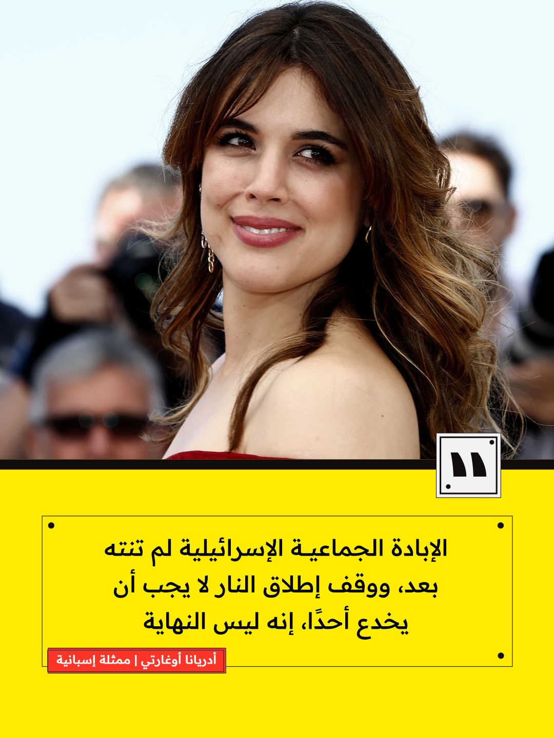 قالت الممثلة الإسبانية "أدريانا أوغارتي" خلال تسلّمها جائزتها في مهرجان ألميريا السينمائي إن ما يجري في فلسطين لا يمكن اعتباره نهاية للجرائم الإسرائيلية.