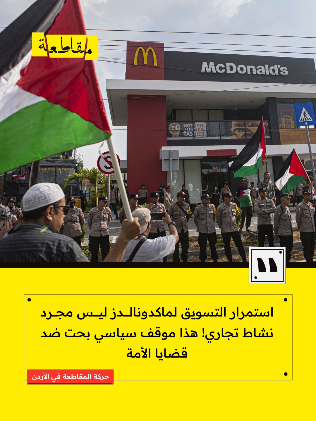 أعربت حركة المقاطعة في الاردن حملة "مش ماكل” عن استنكارها لاستمرار الوكيل المحلي لسلسلة مطاعم "ماكدونالدز" في تسويق وتمثيل العلامة التجارية العالمية، مشيرة إلى أن هذا الأمر ليس مجرد نشاط تجاري، بل موقف سياسي واضح يدعم الاحتلال.