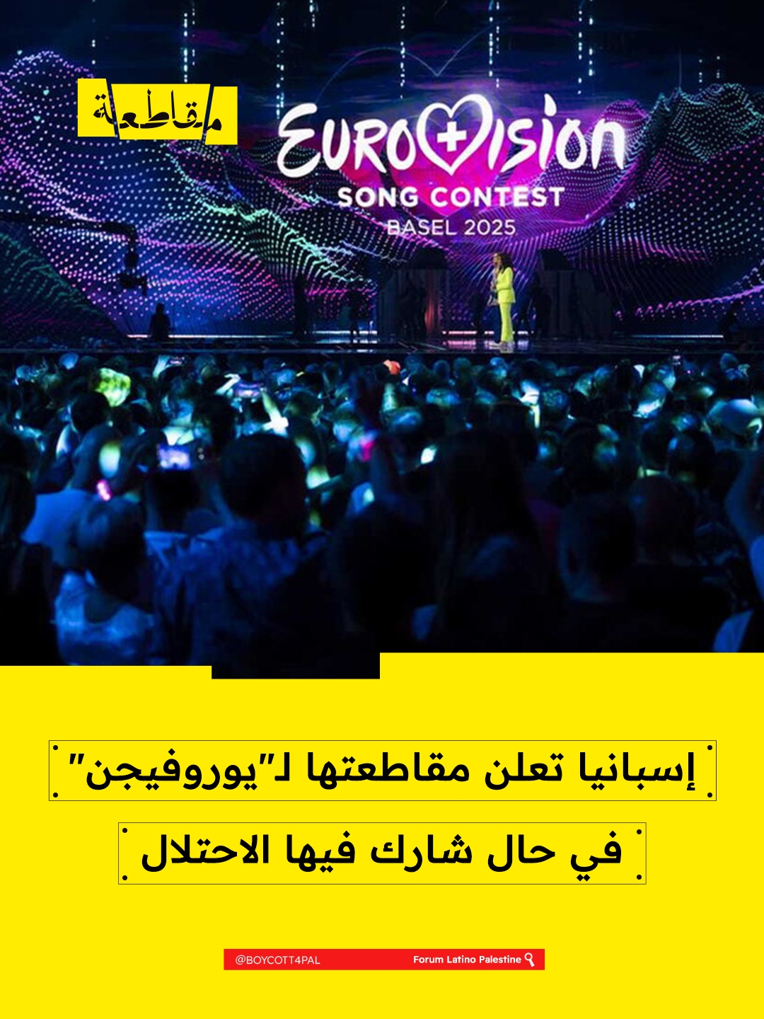 أعلنت إسبانيا رسميًا أنها ستقاطع النسخة المقبلة من مسابقة الأغنية الأوروبية (يوروفيجن) في حال مشاركة "إسرائيل"، معتبرة أن الأخيرة تنتهك قواعد المسابقة بشكل ممنهج وتستغلها لأغراض سياسية، بينما تُعاقب دول أخرى على مخالفات مشابهة.