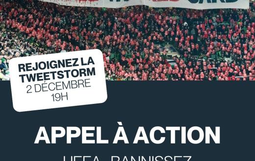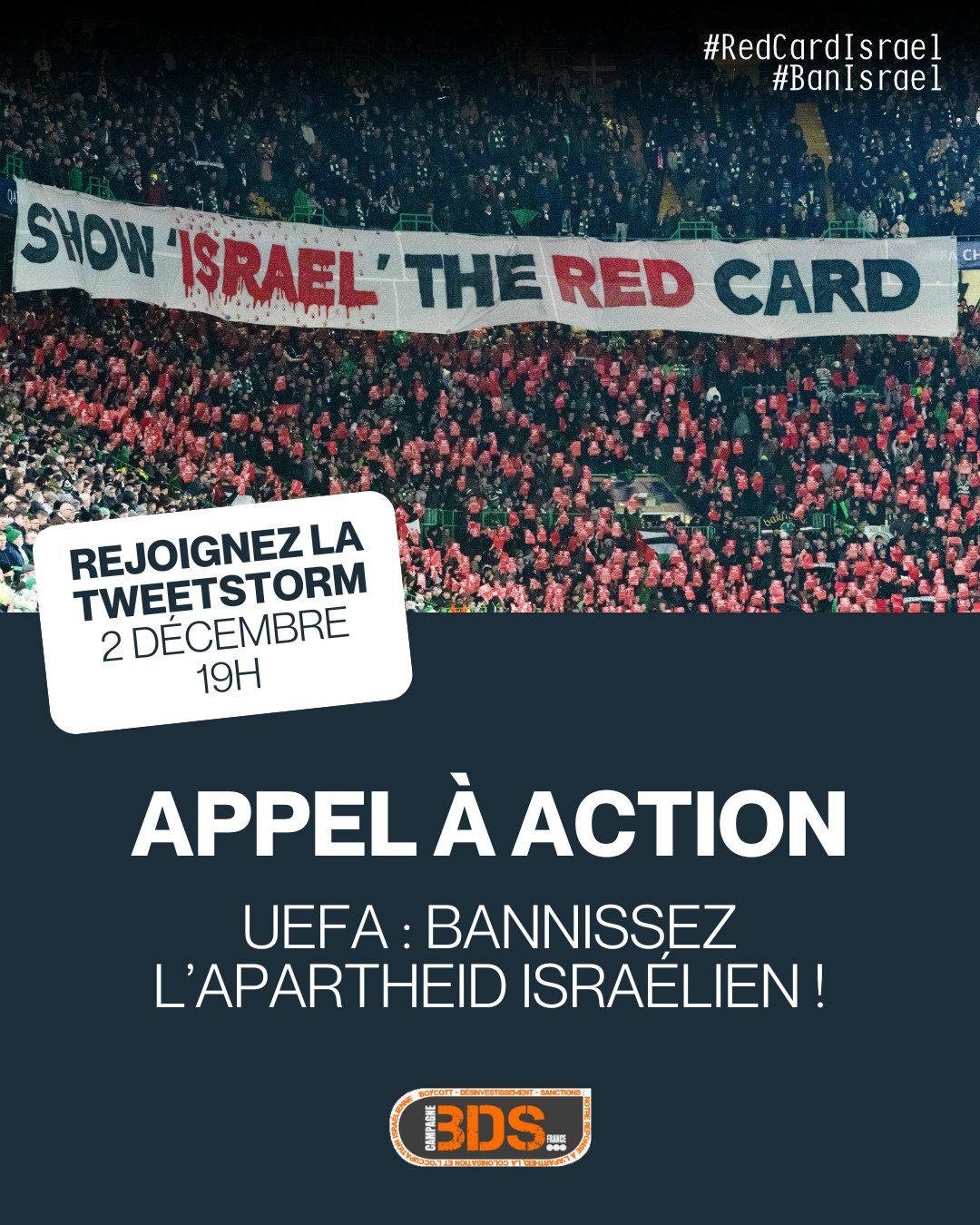 ودعت BDS الجماهير والمناصرين إلى المشاركة في حملة تغريد جماعية (Tweetstorm) يوم 3 ديسمبر الساعة 19:00 على منصات X وBluesky وإنستغرام لدعم المطالبة بتعليق عضوية "إسرائيل" من الاتحاد الأوروبي لكرة القدم ومنظمات رياضية دولية أخرى.