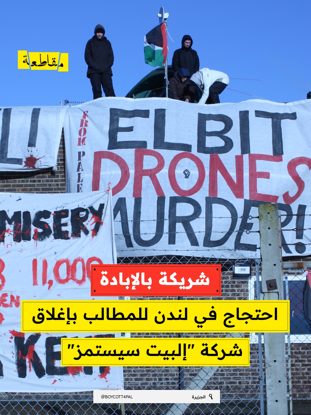 احتجّ مجموعة من النشطاء المتضامنين مع فلسطين، يوم أمس الأحد 30 نوفمبر، على جسر هولبورن في العاصمة البريطانية لندن، مطالبين بإغلاق فرع شركة “البيت سيستمز” الصهيونية، المتخصصة في صناعة الأسلحة والطائرات المسيرة، والتي تزود جيش الاحتلال بأسلحة متقدمة تستخدم في حرب الإبادة على قطاع غزة .