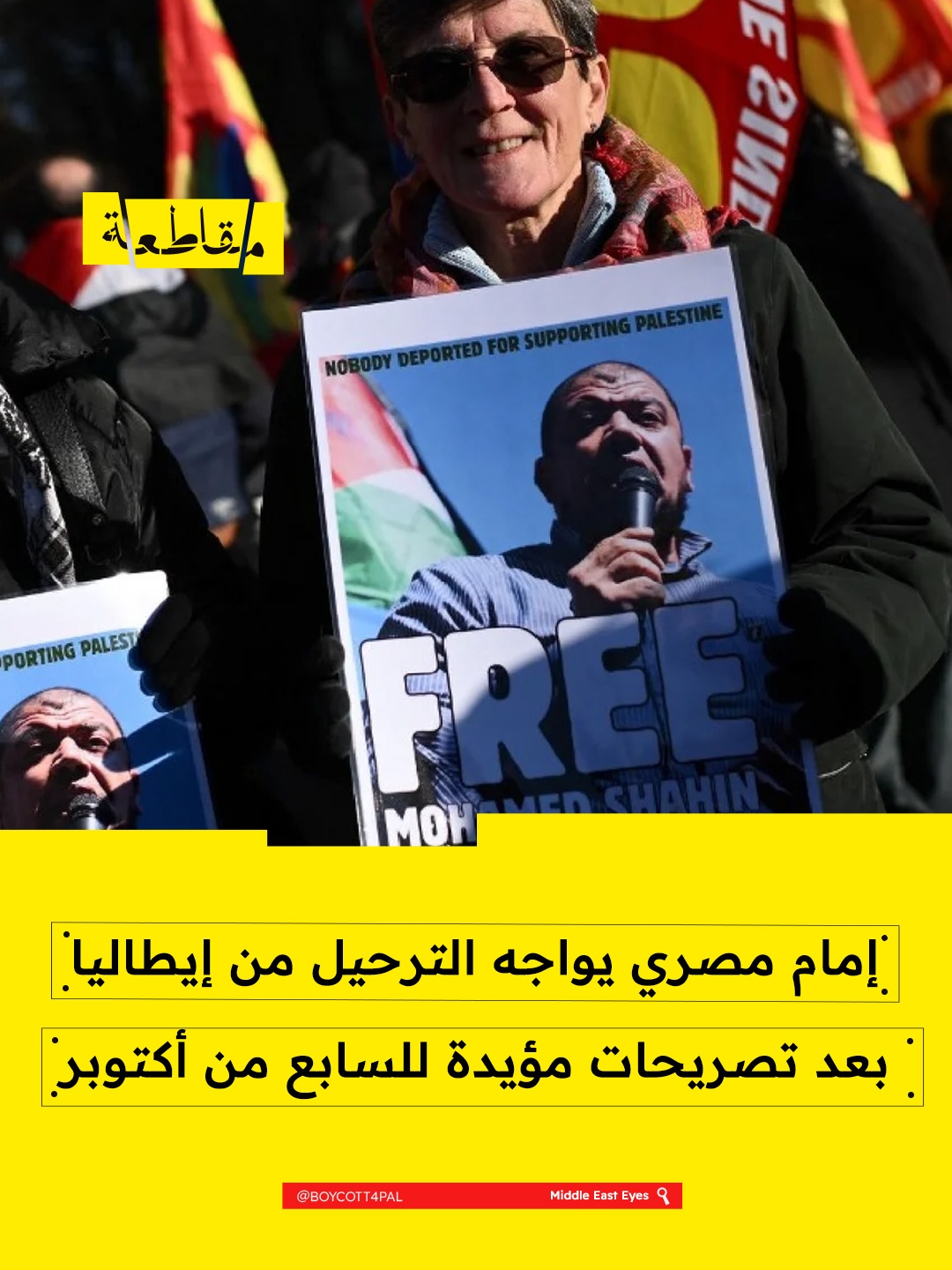 يواجه محمد شاهين، الإمام السابق لمسجد سان سالفاريو في تورينو، إيطاليا، الترحيل إلى مصر بعد مشاركته في تجمع مؤيد لفلسطين في 9 أكتوبر، حيث علّق على يوم السابع من أكتوبر الذي شنته حركة حماس وقال بأنه “عمل مقاو.مة بعد سنوات من الاحتلال”.