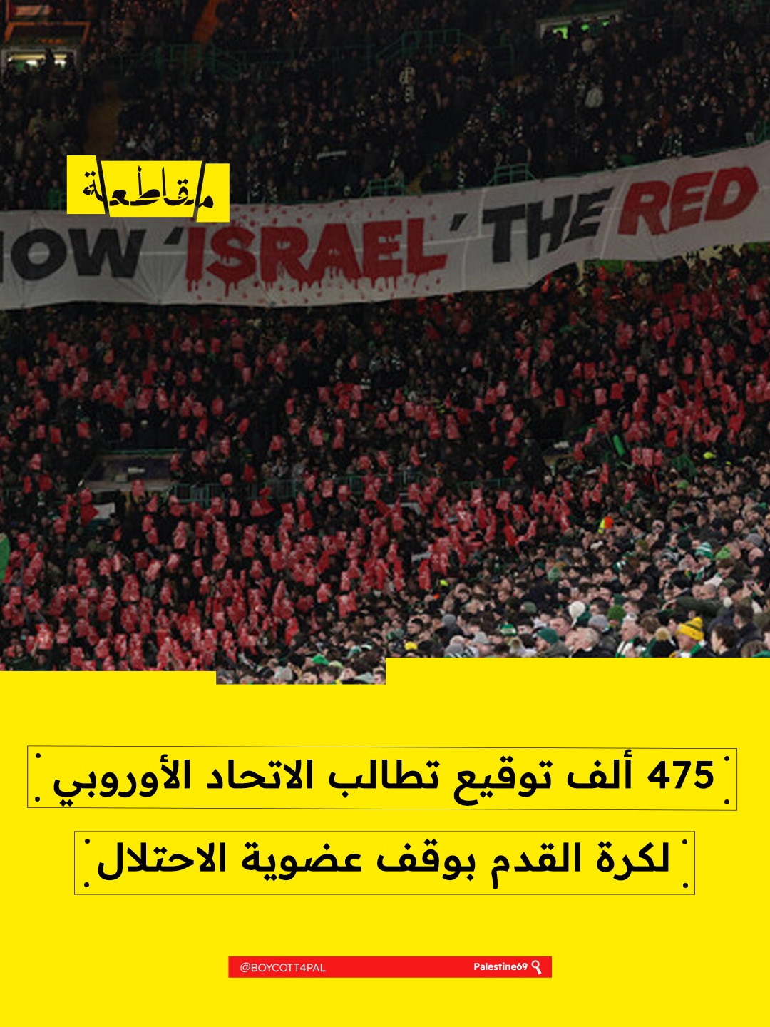 دعا 475 ألف شخص إلى تعليق عضوية "إسرائيل" في المنظمات الرياضية الدولية، مطالبين الاتحاد الأوروبي لكرة القدم بعدم غض الطرف عن الانتهاكات الجسيمة لحقوق الإنسان، ومشدّدين على أن القوانين تسمح باتخاذ الإجراءات اللازمة. حملة #حظر_إسرائيل تؤكد أن المجتمع المدني يطالب بالتحرك الفوري لحماية حقوق الفلسطينيين.