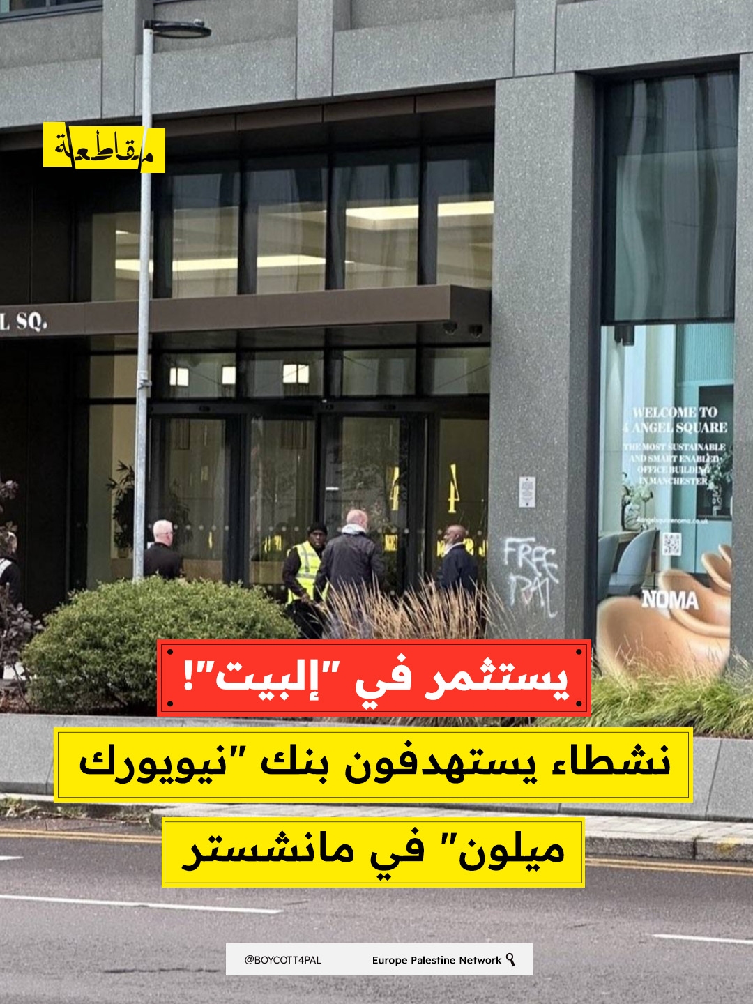 استهدفت مجموعة "أوتونوس" المؤيدة لفلسطين أمس الأربعاء المكاتب الجديدة لبنك نيويورك ميلون في مدينة مانشستر، احتجاجًا على استثماراته العسكرية في كيان الاحتلال. ويضخ البنك أكثر من 10 ملايين دولار في شركة إلبيت سيستمز، أكبر شركة أسلحة إسرائيلية متورطة في تصنيع الطائرات المسيّرة والذخائر المستخدمة ضد الفلسطينيين.