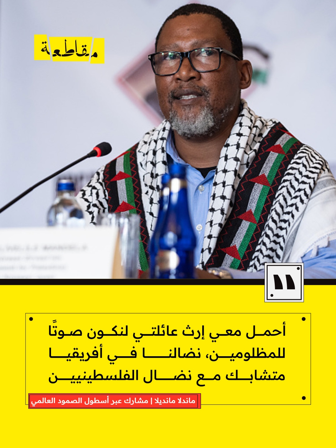 أعلن حفيد الزعيم الجنوب أفريقي نيلسون مانديلا، خلال توجهه للمشاركة في أسطول الصمود العالمي المتجه نحو غزة، أنّ مشاركته تأتي امتدادًا لإرث عائلته في الوقوف إلى جانب المظلومين.